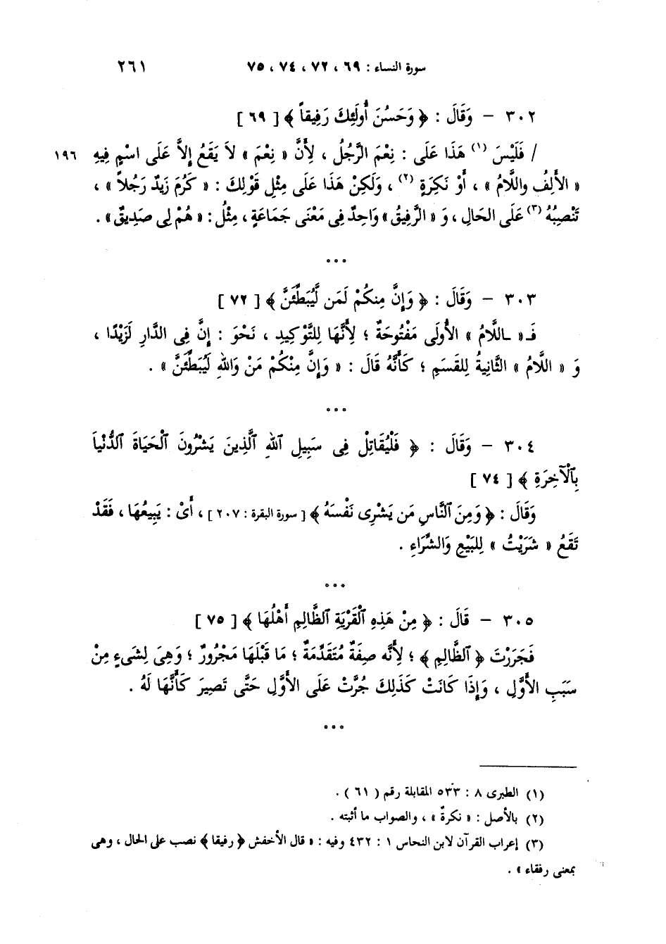 قال {وَحَسُنَ أُولَائِكَ رَفِيقاً} [98ء] فليس هذا على "نِعْمَ الرَّجُل" لأن "نِعْمَ" لا تقع الا على اسم فيه الالف واللام أو نكرة، ولكن هذا على مثل قولك: "كَرُمَ زَيْدٌ رَجُلاً" تنصبه على الحال. و"الرَفِيقُ" واحد في معنى جماعة مثل "هُمْ لي صَدِيقٌ".