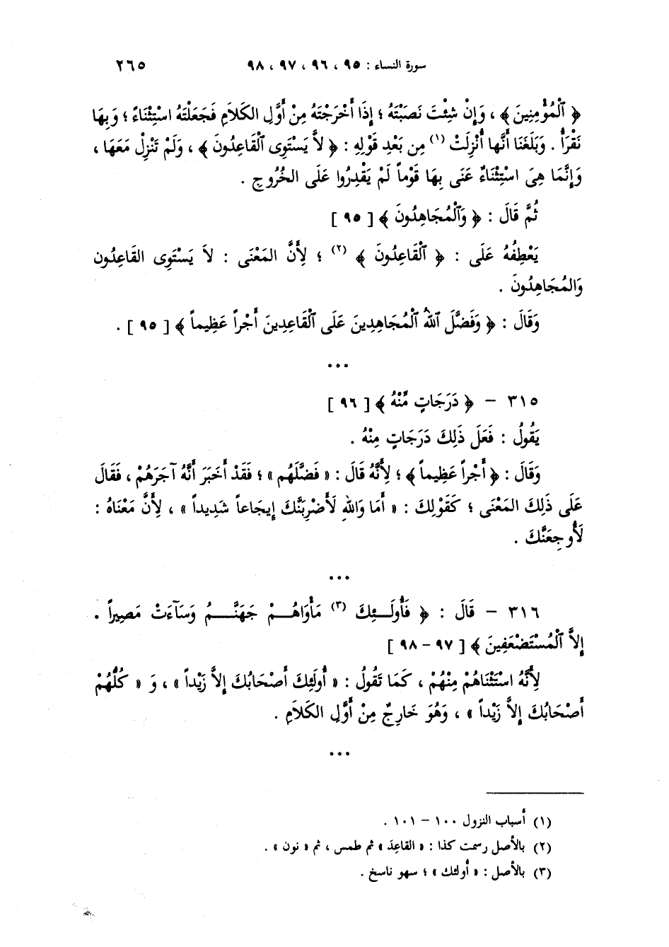 "المُؤْمِنِين" وإِنْ شئت نصبته اذا أخرجته من أول الكلام فجعلته استثناء وبها نقرأ. وبلغنا انها أنزلت من بعد قوله {لاَّ يَسْتَوِي الْقَاعِدُونَ} ولم تنزل معها، وانما هي استثناء عنى بها قوما لم يقدروا على الخروج ثم قال {وَالْمُجَاهِدُونَ} يعطفه على القاعدين لأن المعنى {لاَّ يَسْتَوِي الْقَاعِدُونَ} {وَالْمُجَاهِدُونَ} . وقال {وَفَضَّلَ اللَّهُ الْمُجَاهِدِينَ عَلَى الْقَاعِدِينَ أَجْراً عَظِيماً} {دَرَجَاتٍ مِّنْهُ} [96] يقول فعل ذلك درجات منه. وقال {أَجْراً عَظِيماً} لأنه قال: "فَضَّلهم" فقد أخبر انه آجرهم فقال على ذلك المعنى كقولك: "أمَا وَاللهِ لأَضْرِبَنَكَ إيجاعاً شَدِيداً" لأنَّ معناه: لأُوْجِعَنَّكَ.