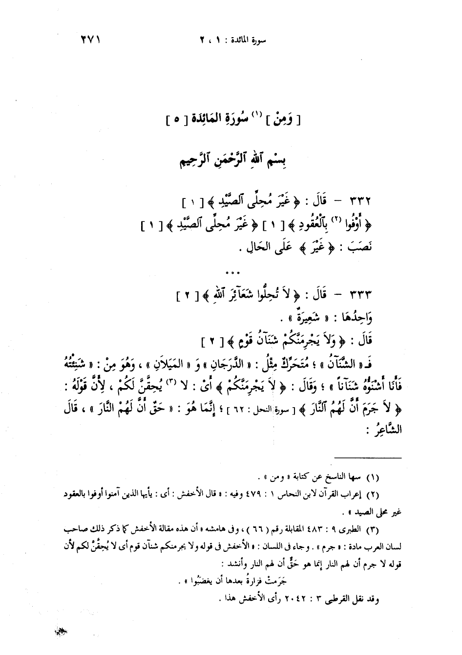 قال: {غَيْرَ مُحِلِّي الصَّيْدِ} {أَوْفُواْ بِالْعُقُودِ} {غَيْرَ مُحِلِّي الصَّيْدِ} نصب (غيرَ) على الحال.