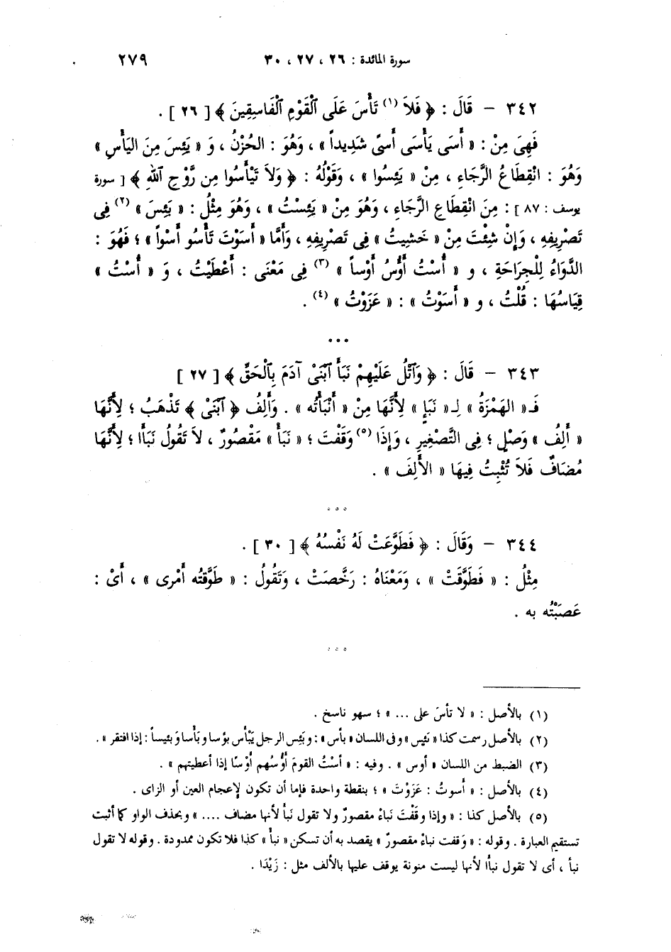 [و] قال {وَاتْلُ عَلَيْهِمْ نَبَأَ ابْنَيْ آدَمَ بِالْحَقِّ} فالهمزة لـ"نَبَأ" لأنها من "أَنْبَاتُهُ". وأَلِف "ابْنَيْ" تذهب لأنها ألف وصل في التصغير. واذا وقفت [قلت] "نبأ" مقصور ولا تقول "نبا" لأنها مضاف فلا تثبت فيها الألف*.