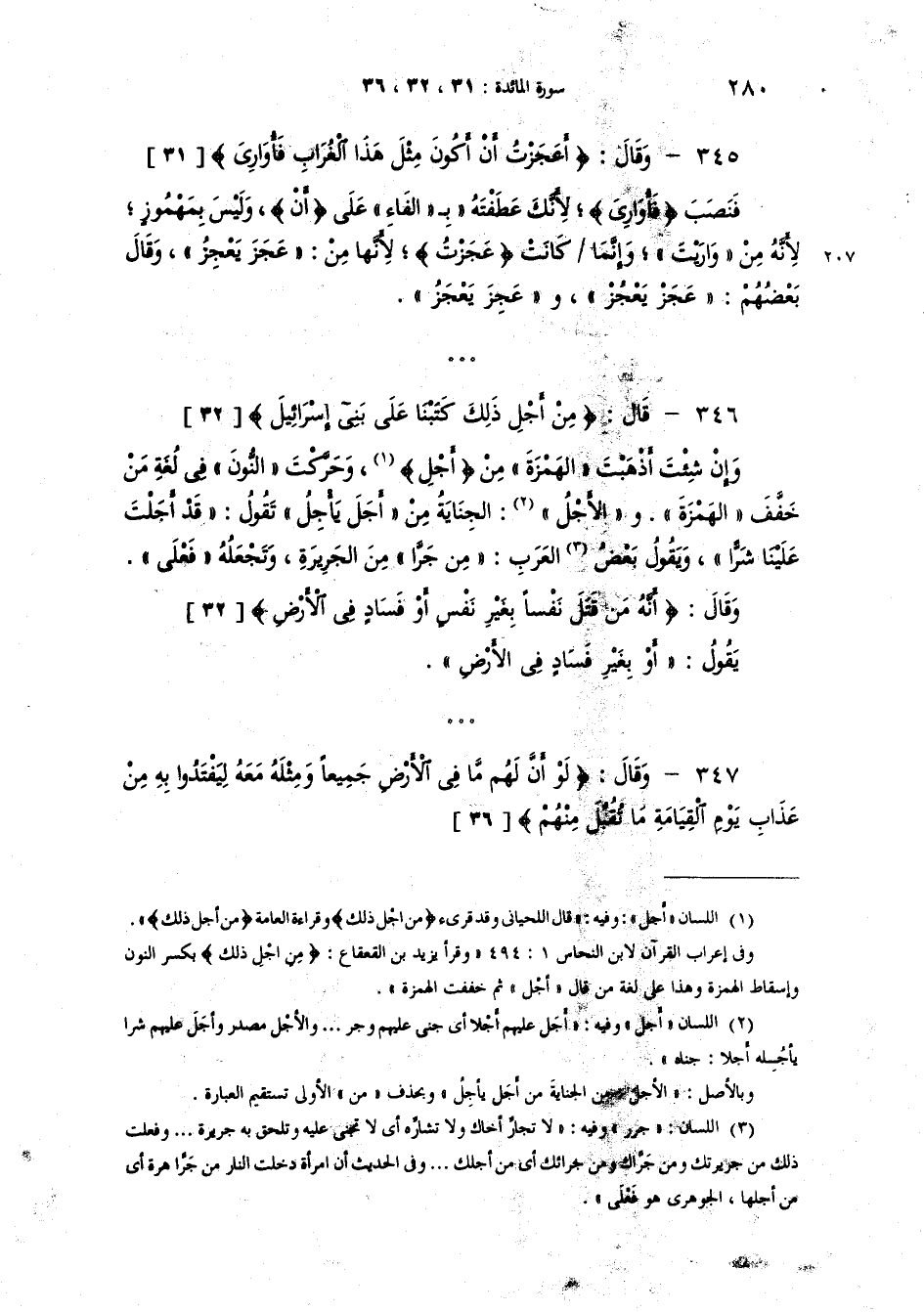 [و] قال {مِنْ أَجْلِ ذلك كَتَبْنَا عَلَى بَنِي إِسْرَائِيلَ} . وان شئت أذهبت الهمزة من {أَجْلِ} وحركت النون في لغة من خفف الهمزة. و"الأَجْلُ": الجناية من "أَجَلَ" "يَأْجِلُ"، تقول: "قَدْ أَجَلْتَ عَلَيْناا شَرْاً" ويقول بعض العرب {مِنْ جَرّا} من: "الجَريرة" ويجعله على "فَعْلَى".