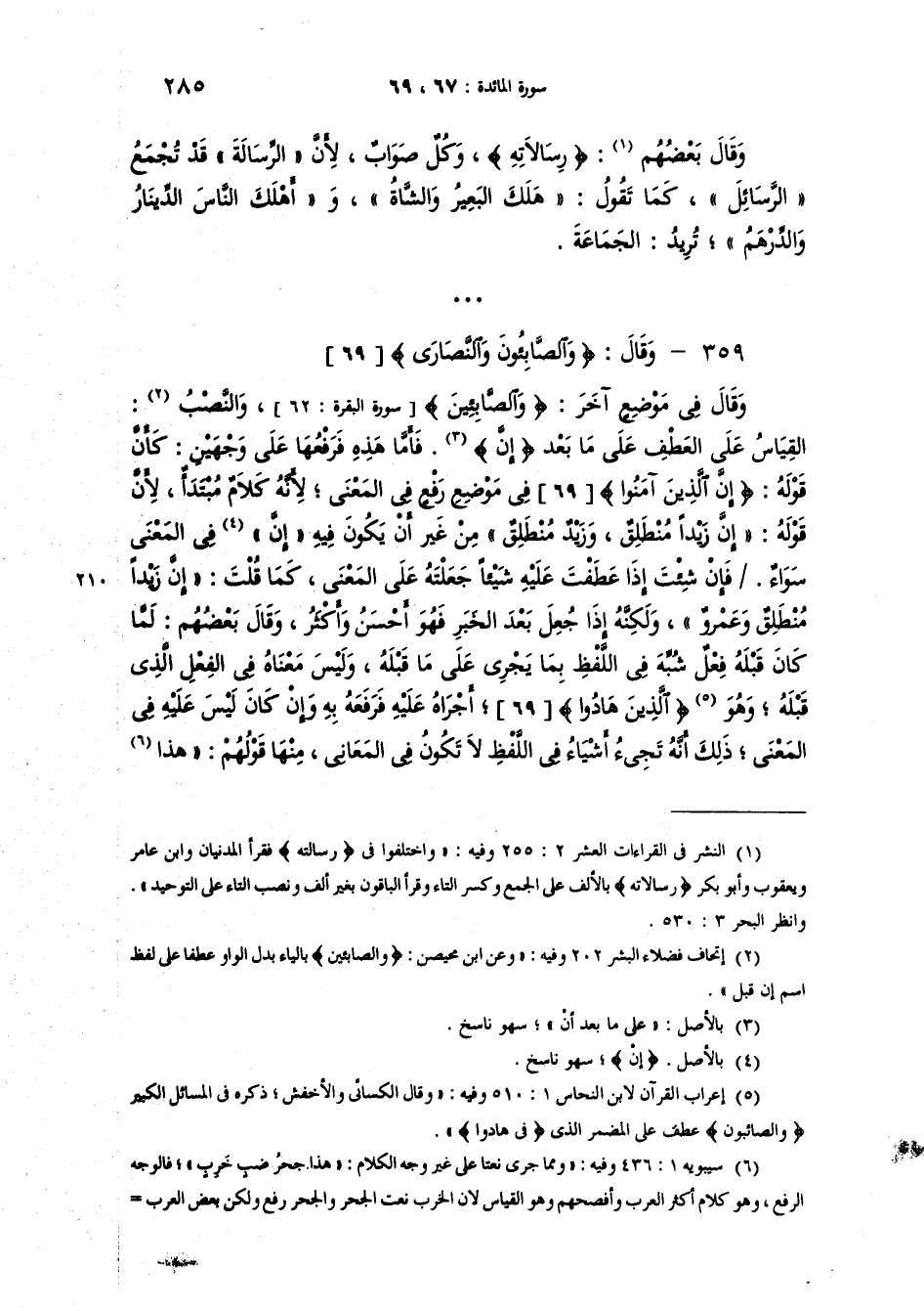وقال: {وَالصَّابِئُونَ وَالنَّصَارَى} وقال في موضع آخر {والصّابِئِينَ} والنصب القياس على العطف على ما بعد {إِنّ} فاما هذه فرفعها على وجهين كأن قوله {إِنَّ الَّذِينَ آمَنُواْ} في موضع رفع في المعنى لأنه كلام مبتدأ لأَنَّ قَوْلَهُ: "إنَّ زَيْداً مُنْطَلِقٌ" و"زَيْدٌ مُنْطَلِقٌ" من غير أن يكون فيه "إنّ" في المعنى سواء [105 ء] ، فان شئت اذا عطفت عليه شيئا جعلته على المعنى. كما قلت: "إنَّ زيداً مُنْطَلِقٌ وعمرٌو". ولكنه اذا جعل بعد الخبر فهو احسن واكثر. وقال بضعهم: "لما كان قبله فعل شبه في اللفظ بما يجري على ما قبله، وليس معناه في الفعل الذي قبله وهو {الَّذِينَ هَادُواْ} اجراه عليه فرفعه به وان كان ليس عليه في المعنى ذلك انه تجيء اشياء في اللفظ لا تكون في المعاني، منها قولهم: "هذا