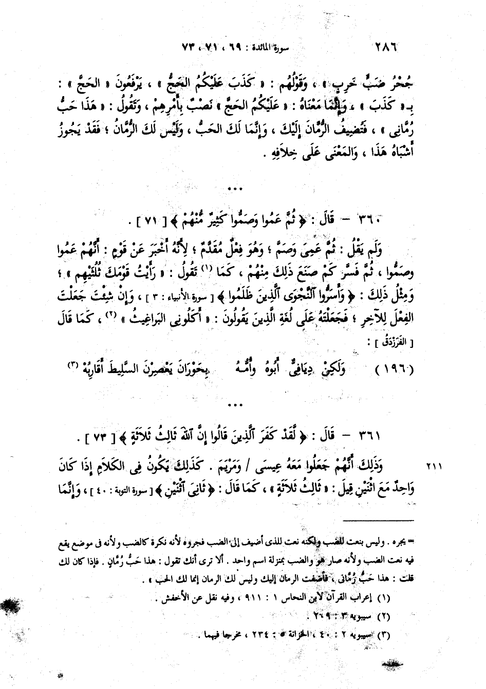 [و] قال {لَّقَدْ كَفَرَ الَّذِينَ قَالُواْ إِنَّ اللَّهَ ثَالِثُ ثَلاَثَةٍ} وذلك انهم جعلوا معه "عِيْسى" [105 ب] و"مَرْيَمَ". كذلك يكون في الكلام اذا كان واحد مع اثنين قيل "ثالِثُ ثلاثَةٍ" كما قال {ثَانِيَ اثْنَيْنِ} وانما