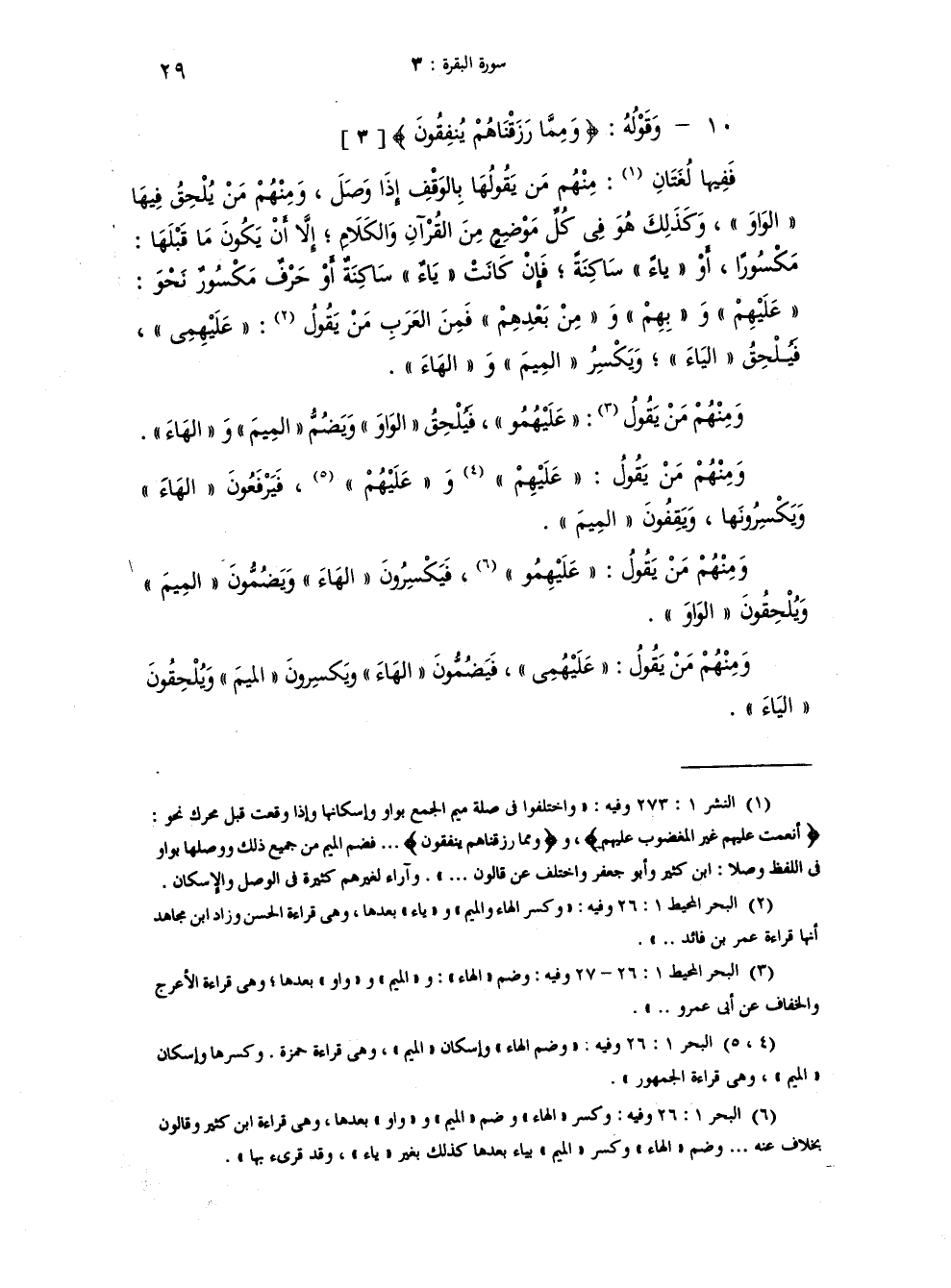 قوله {وَمِمَّا رَزَقْنَاهُمْ يُنْفِقُونَ} ففيها لغتان، منهم من يقولها بالوقف اذا وصل، ومنهم من يلحق فيها الواو. وكذلك هو في كل موضع من القرآن والكلام إلاّ ان يكون ما قبلها مكسورا او ياء ساكنة، فان كانت ياء ساكنة او حرف مكسور نحو "عليْهِم" و "بِهِمْ" و "مِن بعدِهِمْ" فمن العرب من يقول: "عليهِمِي" فيلحق الياء ويكسر الميم والهاء، ومنهم من يقول: "عليْهُمُو" فيلحق الواو ويضم الميم والهاء، ومنهم من يقول: "عليهِم" و "عليهُم"، فيرفعون الهاء ويكسرونها، ويقفون الميم، ومنهم من يقول: "عليهِمُو" فيكسرون الهاء ويضمون الميم ويلحقون الواو، ومنهم من يقول: "عليهُمِي" فيضمون الهاء ويكسرون الميم ويلحقون الياء.
