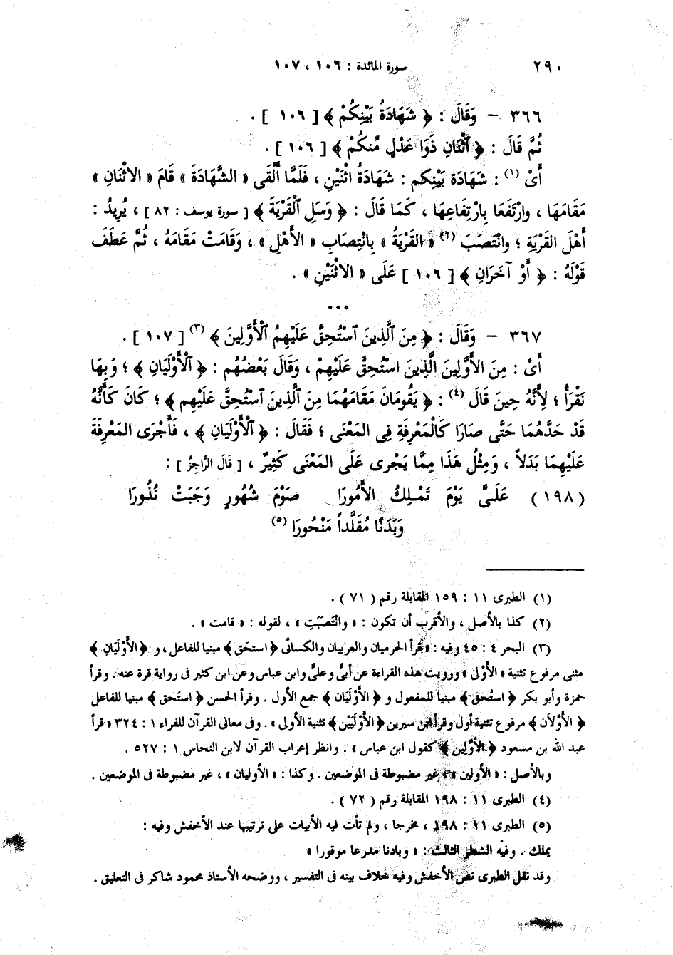 {يِا أَيُّهَا الَّذِينَ آمَنُواْ شَهَادَةُ بَيْنِكُمْ إِذَا حَضَرَ أَحَدَكُمُ الْمَوْتُ حِينَ الْوَصِيَّةِ اثْنَانِ ذَوَا عَدْلٍ مِّنْكُمْ أَوْ آخَرَانِ مِنْ غَيْرِكُمْ إِنْ أَنتُمْ ضَرَبْتُمْ فِي الأَرْضِ فَأَصَابَتْكُم مُّصِيبَةُ الْمَوْتِ تَحْبِسُونَهُمَا مِن بَعْدِ الصَّلاَةِ فَيُقْسِمَانِ بِاللَّهِ إِنِ ارْتَبْتُمْ لاَ نَشْتَرِي بِهِ ثَمَناً وَلَوْ كَانَ ذَا قُرْبَى وَلاَ نَكْتُمُ شَهَادَةَ اللَّهِ إِنَّآ إِذَاً لَّمِنَ الآَثِمِينَ}