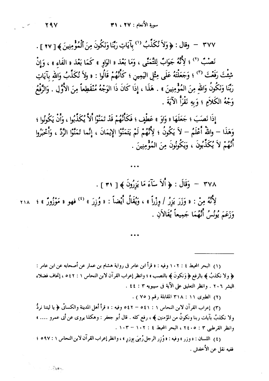 وقال: {وَلاَ نُكَذِّبَ بِآيَاتِ رَبِّنَا وَنَكُونَ مِنَ الْمُؤْمِنِينَ} نصب لأنَّه جواب للتمني وما بعد الواو كما بعد الفاء، وان شئت رفعت وجعلته على مثل اليمين، كأنهم قالوا "وَلاَ نُكَذِّبُ واللهِ بآياتِ رَبِّنا وَنكُونُ واللهِ منَ المُؤمنين". هذا اذا كان ذا الوجه منقطعاً من الأول. والرفع وجه الكلام وبه نقرأ الآية [و] اذا نصب جعلها واو عطف، فكأنهم قد تمنوا الا يكذبوا وان يكونوا. وهذا - والله أعلم - لا يكون، لأنهم لم يتمنوا الايمان انما تمنوا الرد وأخبروا أنهم لا يكذبون ويكونون من المؤمنين.