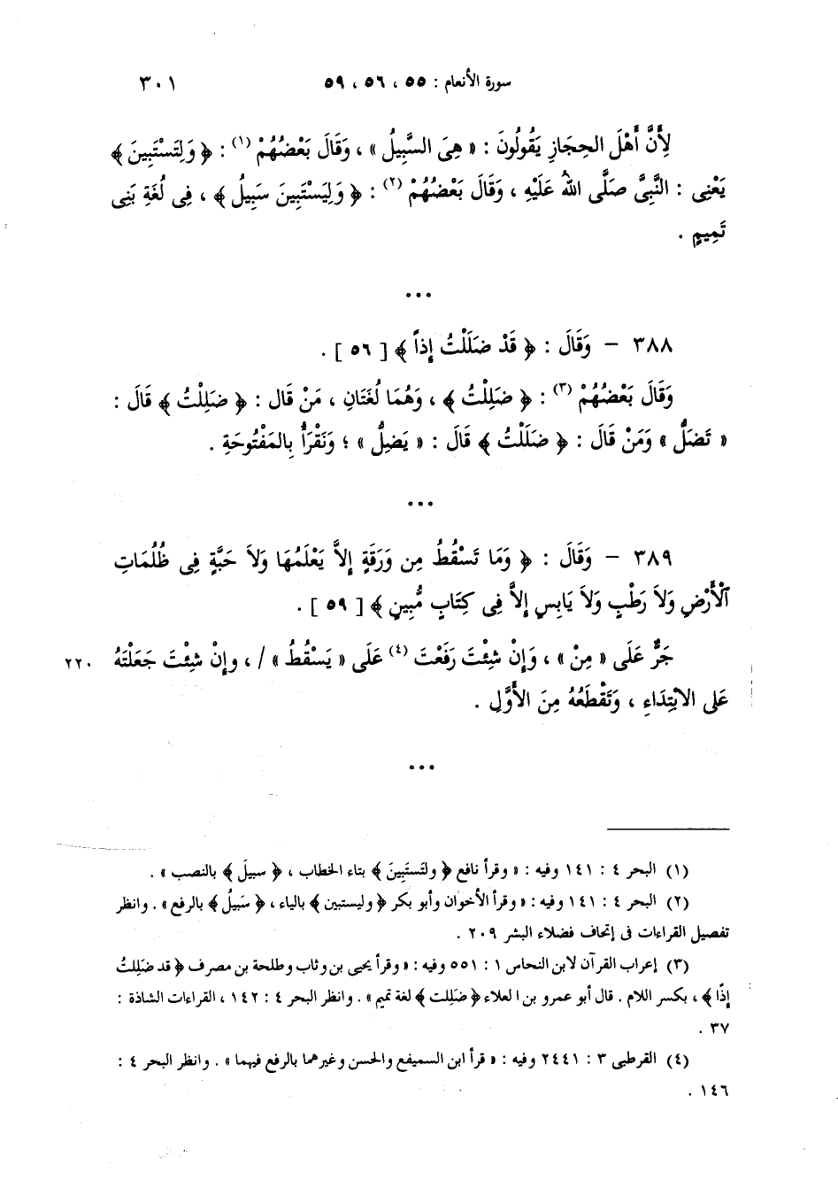 وقال {وَمَا تَسْقُطُ مِن وَرَقَةٍ إِلاَّ يَعْلَمُهَا وَلاَ حَبَّةٍ فِي ظُلُمَاتِ الأَرْضِ وَلاَ رَطْبٍ وَلاَ يَابِسٍ إِلاَّ فِي كِتَابٍ مُّبِينٍ} جر على {مِنْ} وإِنْ شِئْتَ رَفَعْتَ على"تسْقط"، [110 ء] وإِنْ شِئْتَ جَعَلْتَهُ على الابتداءِ وَتَقْطَعُهُ من الأول.