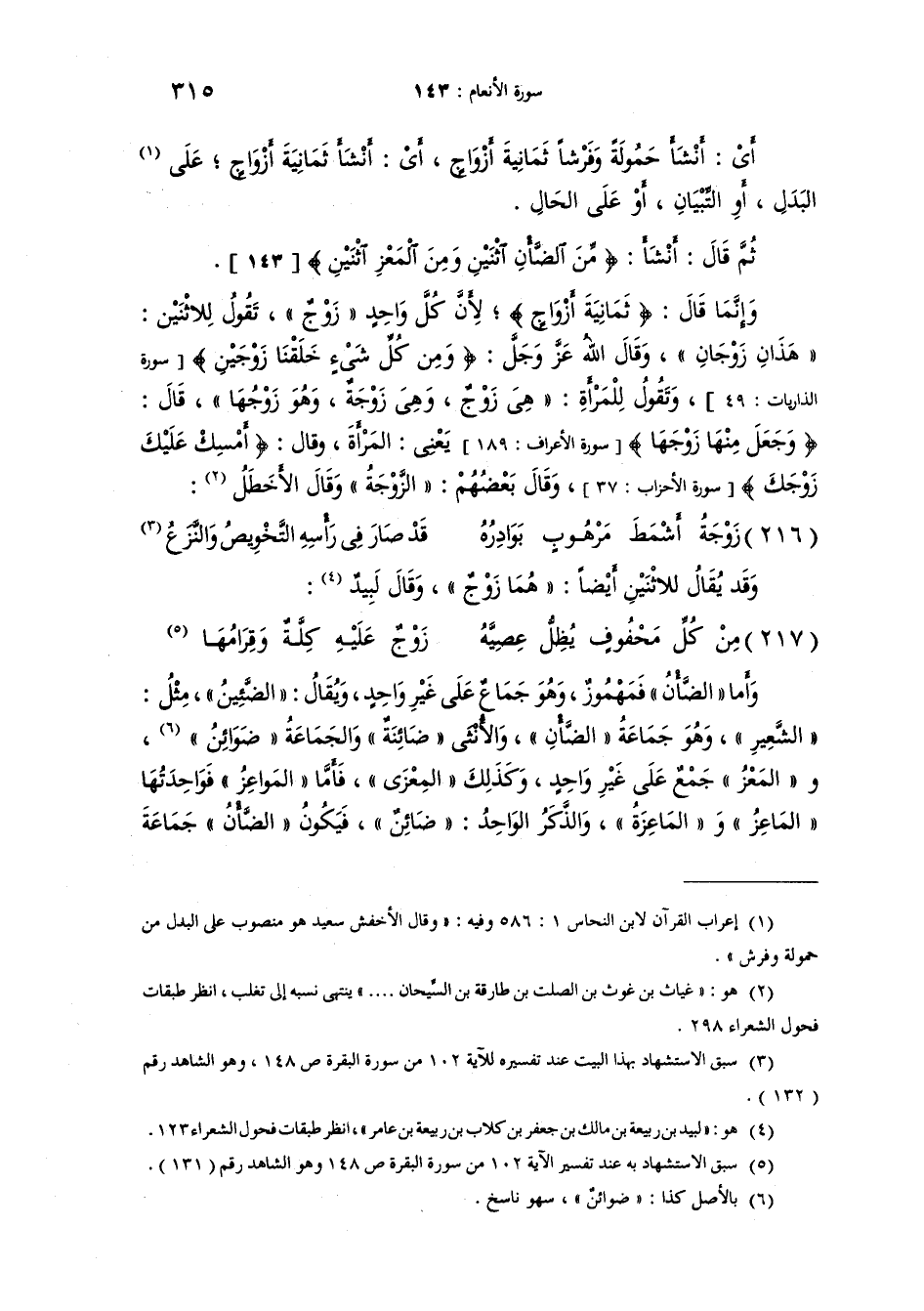 ثم قال: "أَنْشَأَ {مِنَ الضَّأْنِ اثْنَيْنِ وَمِنَ الْمَعْزِ اثْنَيْنِ} وانما قال {ثَمَانِيَةَ أَزْوَاجٍ} لأنَّ كُلَّ واحدٍ "زَوْجٌ". تقول للاثنين: "هذانِ زَوْجانِ" وقال الله عز وجل {وَمِنْ كُلِّ شَيْءٍ خَلَقْنَا زَوْجَيْنِ} وتقول للمرأة: "هي زَوْجٌ" و"هي زَوْجَةٌ" و: "هو زَوْجُها". وقال {وَجَعَلَ مِنْهَا زَوْجَها} يعني المرأة وقال {أَمْسِكْ عَلَيْكَ زَوْجَكَ} وقال بعضهم "الزَوْجَةُ" وقال الأخْطَل: [من البسيط وهو الشاهد السابع والشعرون بعد المئة] :