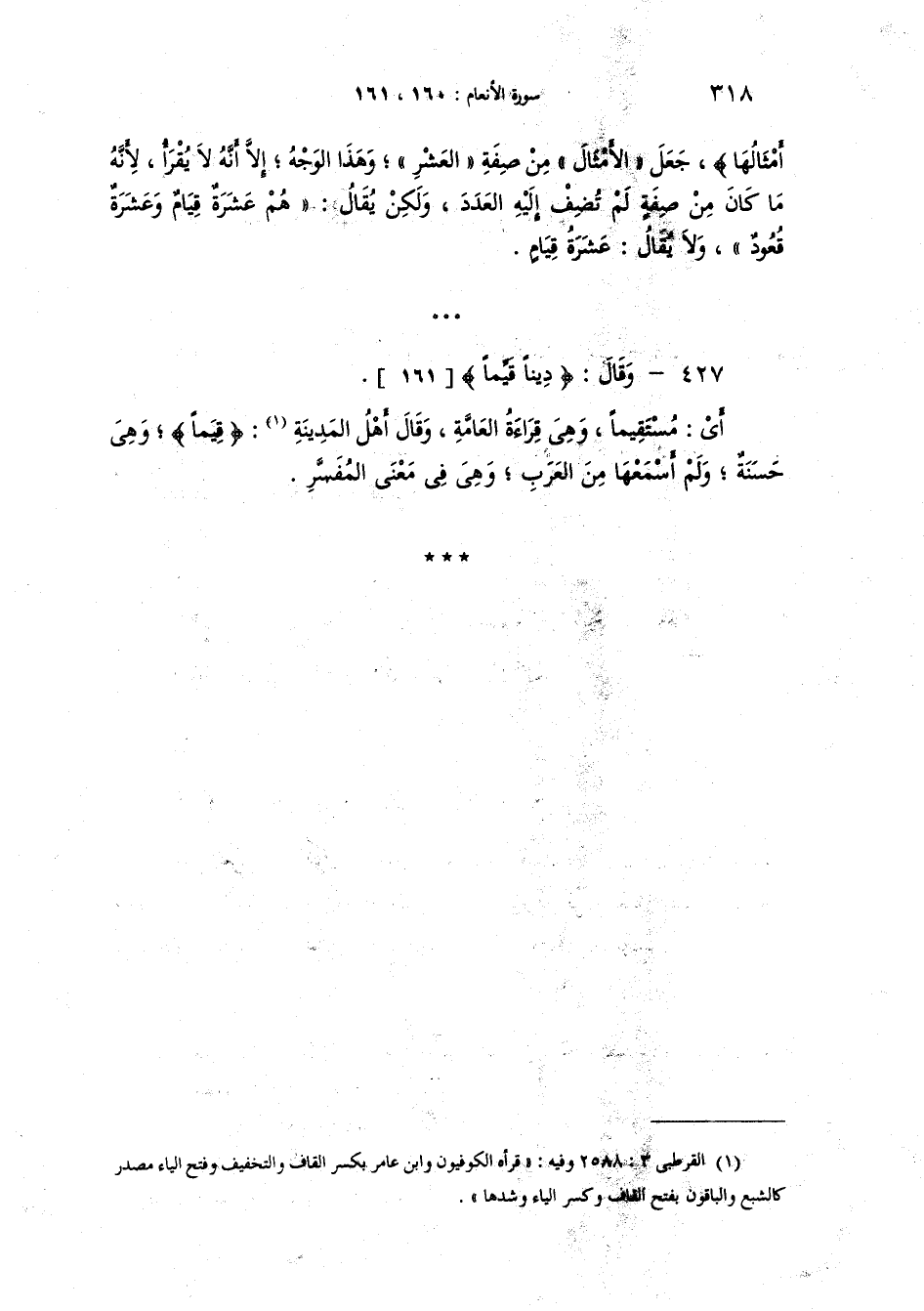 وقال {دِيناً قِيَماً} أيْ: مستقيما وهي قراءة العامة وقال أَهْلُ المدينة {قِيَما} وهي حسنة ولم أَسمَعها من العرب وهي في معنى المفسر.