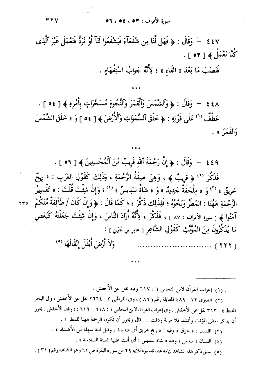وقال {إِنَّ رَحْمَتَ اللَّهِ قَرِيبٌ مِّنَ الْمُحْسِنِينَ} فذكّر {قَرِيب} وهي صفة "الرحمة" وذلك كقول العرب "رِيحٌ خَريقٌ" و"مِلْحَفَةٌ جَديدٌ" و"شاةٌ سَدِيسٌ". وان شئت قلت: تفسير "الرحمة" ها هنا: المطر، ونحوه. فلذلك ذكر. كما قال {وَإِن كَانَ [117 ب] طَآئِفَةٌ مِّنكُمْ آمَنُواْ} فذكر لأنه أراد "الناس". وان شئت جعلته كبعض ما يذكرون من المؤنث كقول الشاعر: [من المتقارب وهو الشاهد الحادي والثلاثون] :