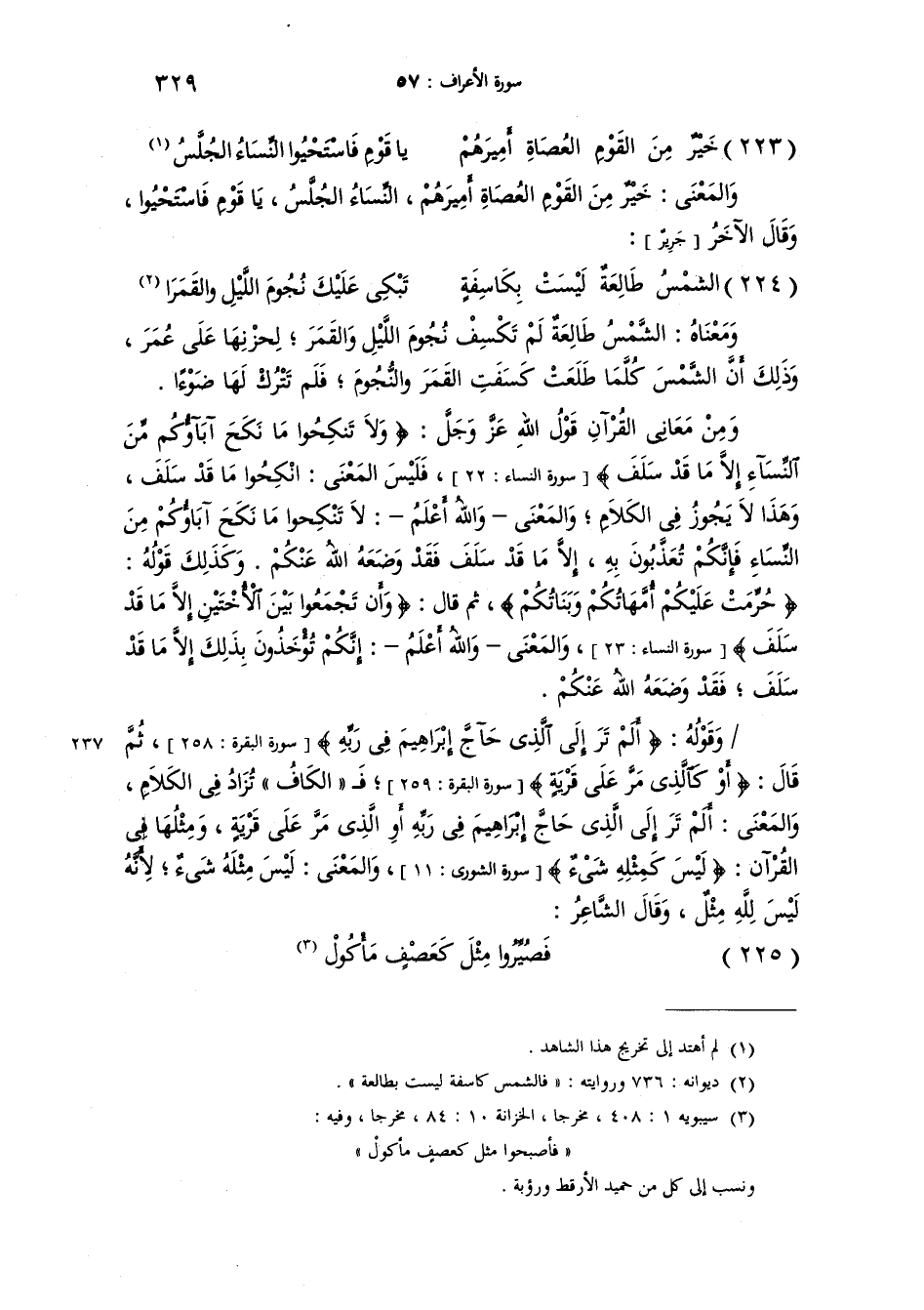 ومن معاني القرآن قول الله عزّ وجل {وَلاَ تَنكِحُواْ مَا نَكَحَ آبَاؤُكُمْ مِّنَ النِّسَآءِ إِلاَّ مَا قَدْ سَلَفَ} فليس المعنى: إِنْكِحوا ما قَدْ سَلَف. وهذا لا يجوز في الكلام والمعنى - والله أعلم - "لا تَنْكِحُوا ما نكحَ آباؤُكُم من النساء فإِنَّكُمْ تُعَذَّبُون بِهِ إِلاّ ما قد سلف فقد وضعه الله عنكم" وكذلك قوله {حُرِّمَتْ عَلَيْكُمْ أُمَّهَاتُكُمْ وَبَنَاتُكُمْ} ثم قال {وَأَن تَجْمَعُواْ بَيْنَ الاخْتَيْنِ إَلاَّ مَا قَدْ سَلَفَ} والمعنى - والله أعلم - أَنَّكُمْ تؤخذون بذلك إِلاّ ما قد سلف فقد وضعه الله عنكم.