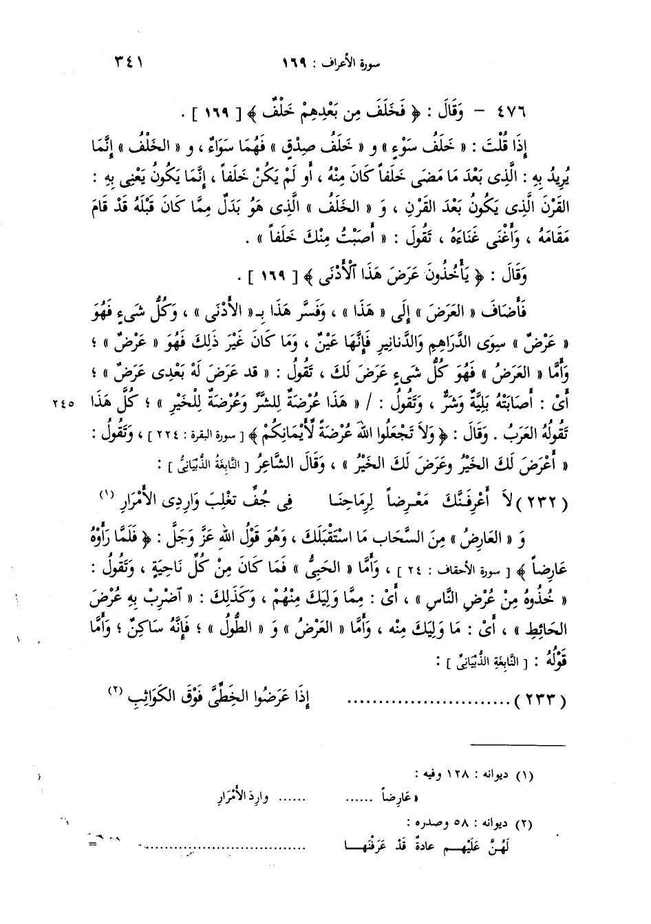 وقال {يَأْخُذُونَ عَرَضَ هذاالأَدْنَى} فأضاف "العَرَضَ" إلى "هذا" وفسر "هذا" بـ"الأَدْنى" وكل شيء فهو عَرْضٌ سوى الدراهم والدنانير فانها عَيْنٌ. وما كان غير ذلك فهو عَرْضٌ واما "العَرَضُ" فهو كل شيء عَرَض لك تقول: "قد عرض له بعدي عَرُضٌ" أي: "أصابَتْهُ بلِيَّةٌ وشَرّ" وتقول: [122 ب] "هذا عُرْضَةٌ للشَرِّ" و"عُرْضَةٌ للخَيْر" كلُّ هذا تقوله العرب. وقال {وَلاَ تَجْعَلُواْ اللَّهَ عُرْضَةً لأَيْمَانِكُمْ} وتقول: "أَعْرَضَ لكَ الخيرُ" و"عَرَضَ لكَ الخَيْرُ" وقال الشاعر: [من الكامل وهو الشاهد السابع عشر بعد المئتين] :
