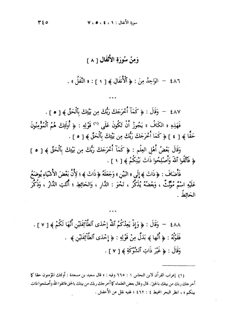 وقال {كَمَآ أَخْرَجَكَ رَبُّكَ مِن بَيْتِكَ بِالْحَقِّ} فهذه الكاف يجوز ان تكون على قوله {أُوْلائِكَ هُمُ الْمُؤْمِنُونَ حَقّاً} [4] {كَمَآ أَخْرَجَكَ رَبُّكَ مِن بَيْتِكَ بِالْحَقِّ} . وقال بعض أهل العلم {كما أخرجك ربك من بيتك بالحق} {فَاتَّقُواْ اللَّهَ وَأَصْلِحُواْ ذَاتَ بِيْنِكُمْ} [1] فأضاف {ذاتَ} الى "البَيْنِ" وجعله {ذاتَ} لأن بعض الأشياء يوضع عليه اسم مؤنث وبعضه يذكر نحو "الدار" و"الحائط" أنّثت "الدار" وذكّر "الحائط".