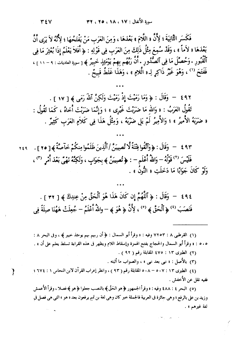 وقال {وَمَا رَمَيْتَ إِذْ رَمَيْتَ ولكنَّ اللَّهَ رَمَى} تقول العرب: "واللهِ ما ضَرَبْتُ غَيْرَهُ" وإِنما ضربت أخاه كما تقول "ضَرَبَهُ الأَميرُ" والاميرُ لم يَلِ ضَرْبَهُ. ومثلُ هذا في كلام العرب كثير.