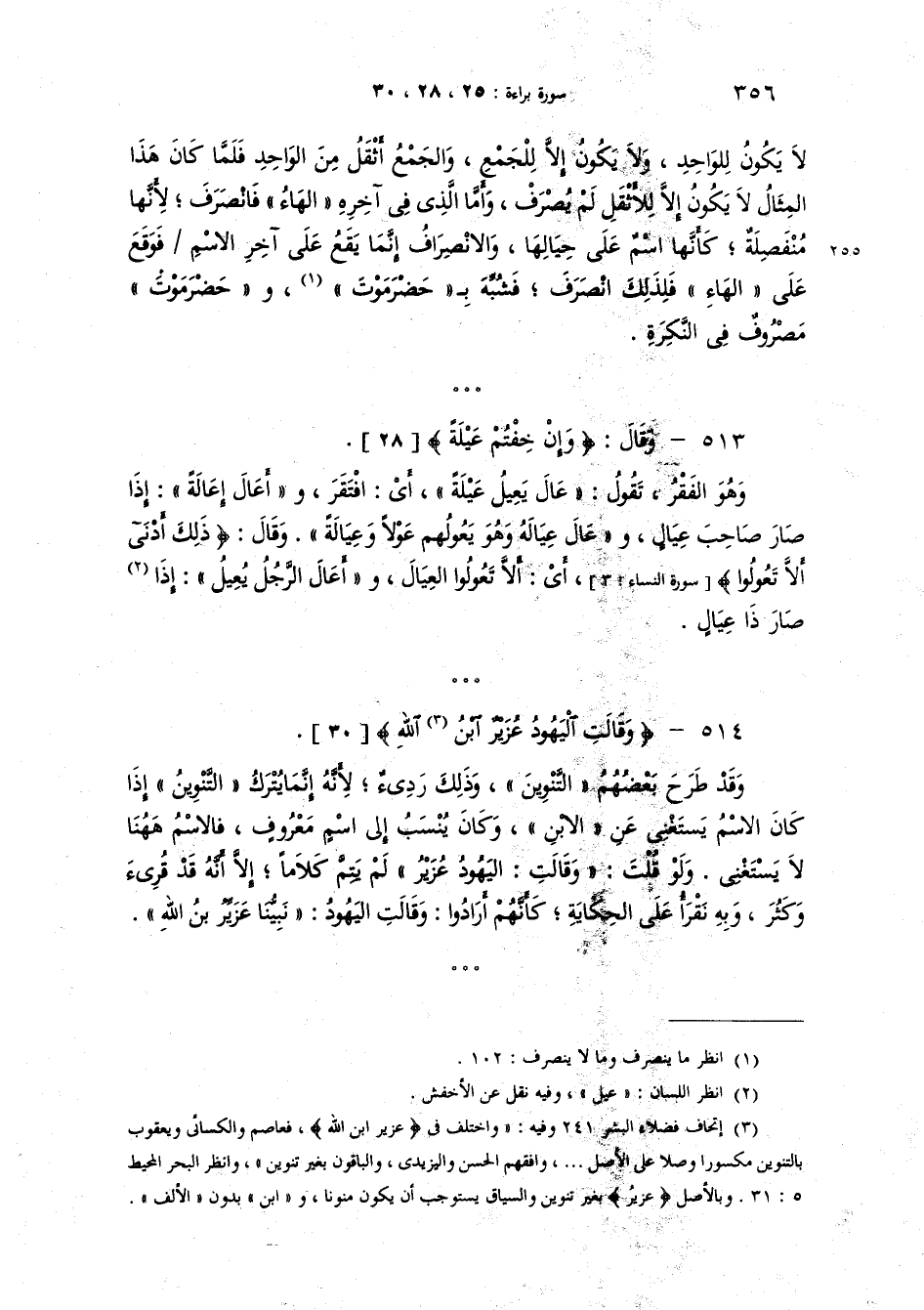 [وقال] {وَقَالَتِ الْيَهُودُ عُزَيْرٌ ابْنُ اللَّهِ} وقد طرح بعضهم التنوين وذلك رديء لانه انما يترك التنوين اذا كان الاسم يستغني عن الابن وكان ينسب الى اسم معروف. فالاسم ها هنا لا يستغني. ولو قلت "وَقَالَتِ اليَهودُ عَزَيْزُ" لم يتمّ كلاما الا انه قد قرىء وكثر وبه نقرأ على الحكاية كأنهم أرادوا "وَقَالَتِ الْيَهُودُ نَبِيُّنا عُزَيْزُ ابنُ اللهِ".