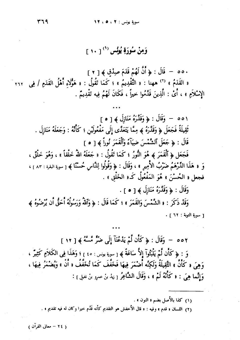 وقال {وَقَدَّرَهُ مَنَازِلَ} ثقيلة فجعل (وَقَدَّرُهُ) مما يتعدى الى مفعولين كأنه "وجعله منازل". وقال {جَعَلَ الشَّمْسَ ضِيَآءً وَالْقَمَرَ نُوراً} فجعل القمر هو النور كما تقول: "جَعَلَهُ اللهُ خَلْقاً" وهو "مخلوق" و"هذا الدِرْهَمُ ضَرْبُ الأَمِير". وهو "مضروب". وقال {وَقُولُواْ لِلنَّاسِ حُسْناً} فجعل الحسن هو المفعول كالخلق.