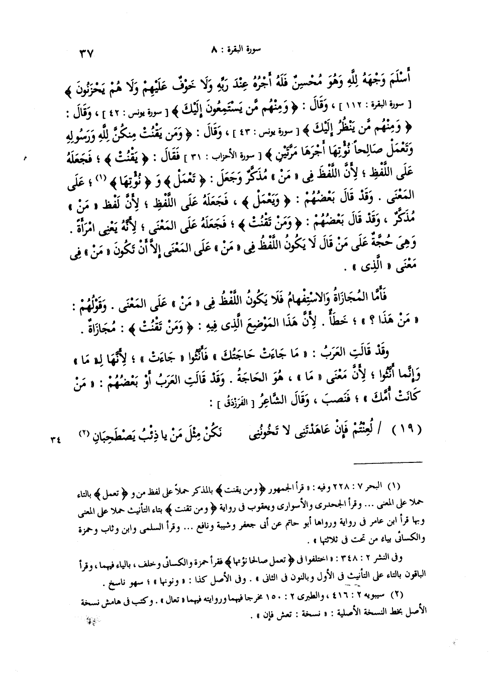 أَسْلَمَ وَجْهَهُ للَّهِ وَهُوَ مُحْسِنٌ فَلَهُ أَجْرُهُ عِندَ رَبِّهِ وَلاَ خَوْفٌ عَلَيْهِمْ وَلاَ هُمْ يَحْزَنُونَ} وقال {وَمِنْهُمْ مَّن يَسْتَمِعُونَ إِلَيْكَ} وقال {وَمِنهُمْ مَّن يَنظُرُ إِلَيْكَ} وقال {وَمَن يَقْنُتْ مِنكُنَّ للَّهِ وَرَسُولِهِ وَتَعْمَلْ صَالِحاً نُؤْتِهَآ أَجْرَهَا مَرَّتَيْنِ} فقال {يَقْنُتْ} فجعله على اللفظ، لان اللفظ في {مَن} مذكر وجعل {تَعْمَلْ} و {نُؤْتِهَآ} على المعنى. وقد قال بعضهم {ويَعْمَلْ} فجعله على اللفظ لان لفظ {مَنْ} مذكر. وقد قال بعضهم {وَمَنْ تَقْنُتْ} فجعله على المعنى لانه يعني امرأة. وهي حجة على من قال: "لا يكون اللفظ في مَن على المعنى الا ان تكون {مَنْ} في معنى {الذي} ، فاما [في] المجازاة والاستفهام فلا يكون اللفظ في {مَنْ} على المعنى.