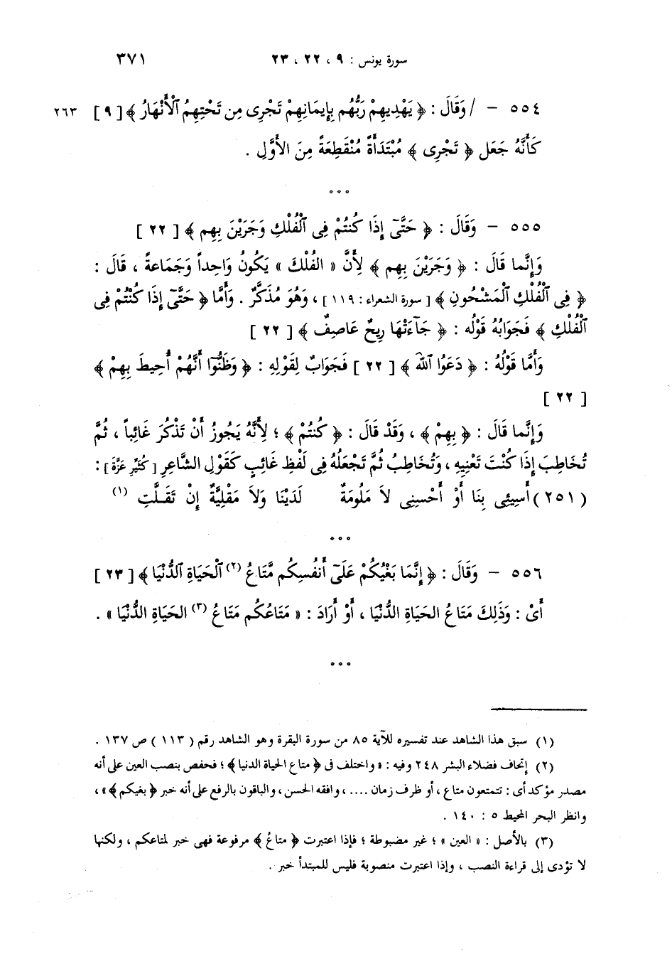 وقال {حَتَّى إِذَا كُنتُمْ فِي الْفُلْكِ وَجَرَيْنَ بِهِم} وانما قال {وَجَرَيْنَ بِهِم} لأنْ (الفُلْكَ) يكون واحدا وجماعة. قال {فِي الْفُلْكِ الْمَشْحُونِ} وهو مذكر. واما (حتَّى أَذا كُنْتُمْ في الفُلْكِ) فجوابه قوله {جَآءَتْهَا رِيحٌ عَاصِفٌ} .