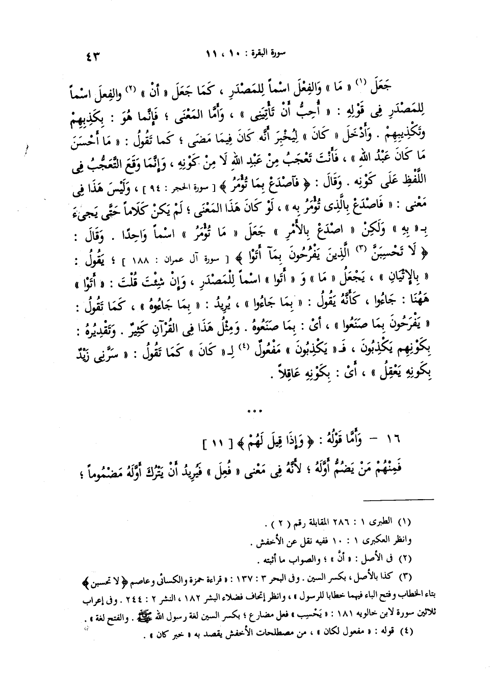 جعل "ما" والفعل اسما للمصدر كما جعل "أنْ" والفعل اسما للمصدر في قوله "أُحبُّ أَنْ تأتِيني", واما المعنى فانما هو "بكذِبهِم" و "تَكْذيبِهِم". وأدخل "كان" ليخبر انه كان فيما مضى، كما تقول: "ما أحسنَ ما كانَ عبدُ الله" فأنت تَعَجَّبُ من" عبد الله لا من "كونه". وانما وقع التعجبُ في اللفظ على كونه. وقال {فَاصْدَعْ بِمَا تُؤْمَرُ} وليس هذا في معنى "فاصدع بالذي تؤمر به". لو كان هذا المعنى لم يكن كلاما حتى تجيء بـ"به" ولكن "إصدع بالأمر" جعل "ما تؤمر" اسما واحداً. وقال {ولاَ تَحْسَبَنَّ الَّذِينَ يَفْرَحُونَ بِمَآ أَتَوْاْ} يقول "بالإِتيان" يجعل "ما" و "أَتَوْا" اسما للمصدر. وإنْ شئتَ قلت: "أَتَوْا" ها هنا "جاءُوا" كأنه يقول: "بما جاءوا" يريد "جاءوه" كما تقول "يفرحون بما صنعوا" أي "بما صنعوه" ومثل هذا في القرآن كثير. وتقديره "بكونِهم يكذبون" فـ"يكذبون" مفعول لـ"كان" كما تقول: "سرني زيد بِكونه يعقل" اي: بكونه عاقلا.