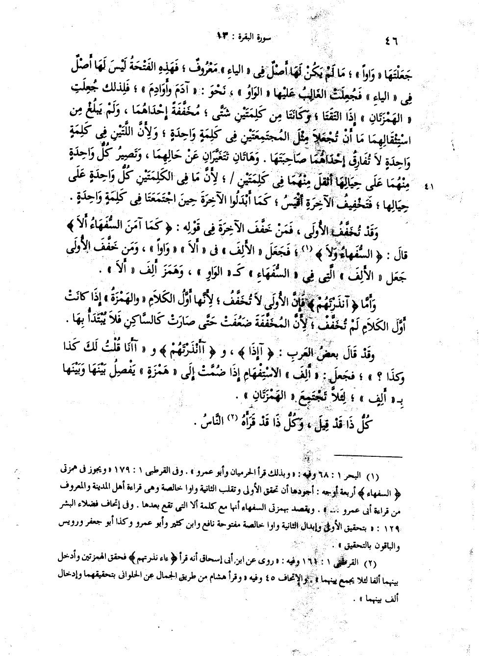 قوله {كَمَآ آمَنَ السُّفَهَآءُ ألا} قال {السفهاءُ ولا} فجعل الالف في (ألا) واوا. ومن خفف الأولى جعل الالف التي في (السفهاء) كالواو وهمز الف (ألاّ) . واما {أَأَنْذَرْتَهُمْ} فإنَّ الأولى لا تخفف لأنها اول الكلام. والهمزة اذا كانت اول الكلام لم تخفف لأن المخففة ضعفت حتى صارت كالساكن فلا يبتدأ بها. وقد قال بعض العرب (آإذا) و (آأنذرتهم) و "آأنا قلت لك كذا وكذا" فجعل ألف الاستفهام اذا ضمت الى همزة يفصل بينها وبينها بألف لئلا تجتمع الهمزتان. كل ذا قد قيل وكل ذا قد قرأه الناس.