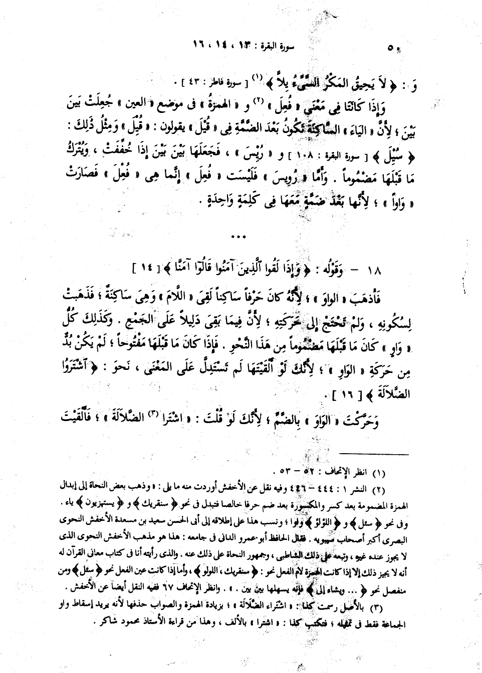 قوله {وَإِذَا لَقُواْ الَّذِينَ آمَنُواْ قَالُوا آمَنَّا} فأذهب الواو لانه كان حرفا "ساكنا لقي اللام وهي ساكنة فذهبت لسكونه ولم تحتج الى حركته لان فيما بقي دليلا على الجمع. وكذلك كل واو ما قبلها مضموما من هذا النحو. فاذا كان ما قبلها مفتوحا لم يكن بد من حركة الواو لانك لو القيتها لم تستدل على المعنى نحو {اشْتَرُواْ الضَّلاَلَةَ} وحركت الواو بالضم لانك لو قلت "اشتر الضلالة" فألقيت