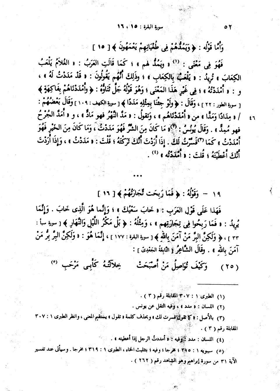 أما قوله {وَيَمُدُّهُمْ فِي طُغْيَانِهِمْ يَعْمَهُونَ} فهو في معنى "ويَمُدُّ لَهُم" كما قالت العرب: "الغلام يلعب الكِعاب" تريد: "يلعب ** بالكِعاب" وذلك أَنهم يقولون "قد مَدَدْتُ له" و "أَمْدَدْتُه" في غير هذا المعنى وهو قوله جل ثناؤه {وَأَمْدَدْنَاهُم بِفَاكِهَةٍ} وقال {وَلَوْ جِئْنَا بِمِثْلِهِ مَدَداً} . وقال بعضهم [23ء] (مِدادا) و (مَدّا) من "أَمْدَدْناهُم" وتقول "مَدّ النهرُ فهو مادّ" و "أَمَدّ الجُرُح فهو مُمِدّ". وقال يونس: "ما كان من الشَرّ فهو "مدَدْت" وما كان من الخير فهو "أَمْدَدْت". [فـ] تقول كما فسرت له فاذا اردت أنك تركته قلت: "مَدَدْتُ له" واذا أردت أنك اعطيته قلت: "أَمْدَدْتُه".