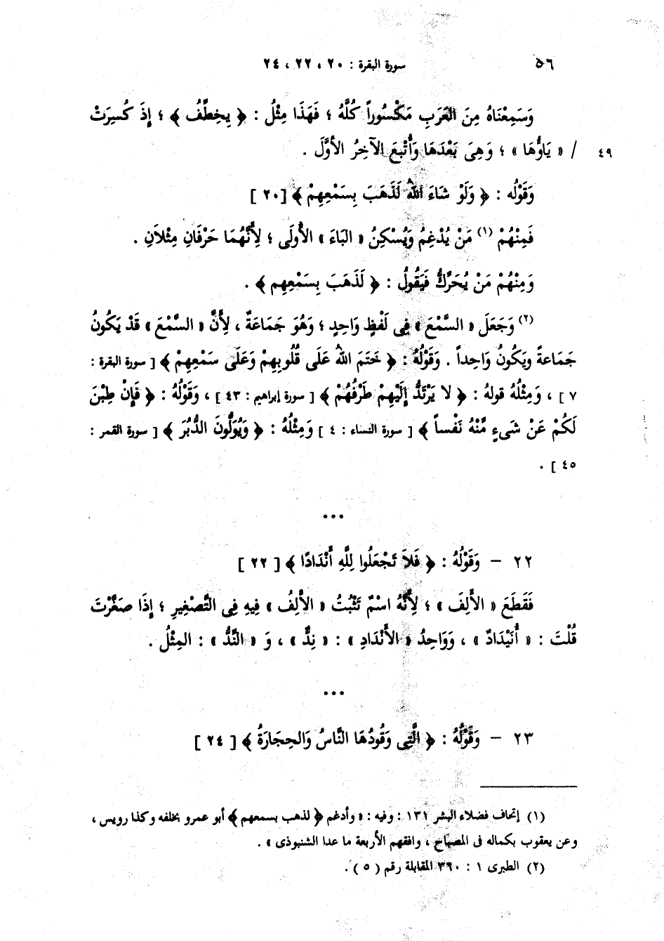 وقوله {وَلَوْ شَآءَ اللَّهُ لَذَهَبَ بِسَمْعِهِمْ} فمنهم من يدغم ويسكن الباء الأولى لانهما حرفان مثلان. ومنهم من يحرك فيقول {لَذَهَبْ بِسَمْعِهِمْ} وجعل "السَمْع" في لفظ واحد وهو جماعة لان "السَمْعَ" قد يكون جماعة و "قد] يكون واحداً و [مثله] قوله {خَتَمَ اللَّهُ عَلَى قُلُوبِهمْ وَعَلَى سَمْعِهِمْ} ومثله قوله {لاَ يَرْتَدُّ إِلَيْهِمْ طَرْفُهُمْ} وقوله {فَإِن طِبْنَ لَكُمْ عَن شَيْءٍ مِّنْهُ نَفْساً} ومثله {وَيُوَلُّونَ الدُّبُرَ} .