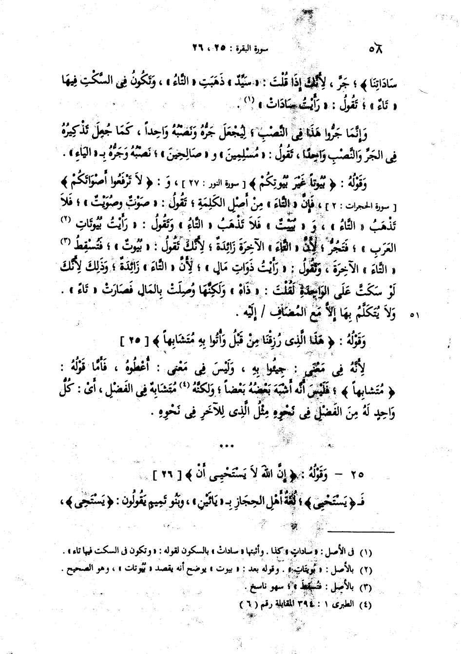 سَادَاتِنا} جرّ لانك اذا قلت: "ساده" ذهبت التاء. وتكون في السكت فيها تاء، تقول: "رأيت ساداتٍ"، وانما جرّوا هذا في النصب ليجعل جرّه ونصبه واحداً، كما جعل تذكيره في الجر والنصب واحدا، تقول: "مسلمين و "صالحين" نصبه وجره بالياء. وقوله {بُيُوتاً غَيْرَ بُيُوتِكُمْ} و {لاَ تَرْفَعُواْ أَصْوَاتَكُمْ} فان التاء من اصل الكلمة تقول "صوت" و "صويت" فلا تذهب التاء، و "بيت" [و "بُوَيْت"] * فلا تذهب التاء. وتقول: "رأيت بُوَيْتاتِ العربِ" فتجرّ، لان التاء الآخرة زائدة لانك تقول: "بيوت" فتسقط التاء الآخرة. وتقول: "رأيت ذواتِ مال" لان التاء زائدة، وذلك لانك لو سكت على الواحدة لقلت: "ذاه" ولكنها وصلت بالمال فصارت تاء لا يتكلم بها الا مع المضاف [25ب] اليه.