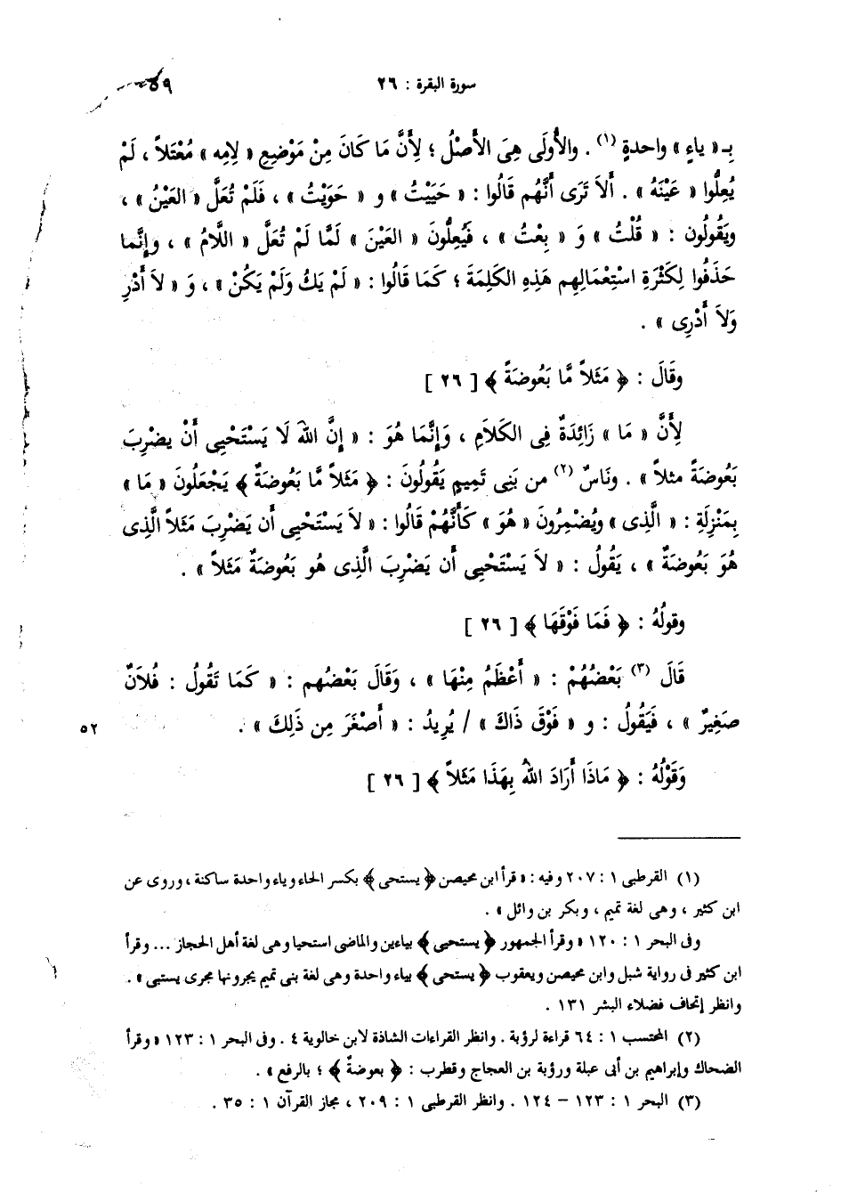 وقال {مَثَلاً مَّا بَعُوضَةً} لان "ما" زائدة في الكلام وانما هو إنَّ الله لا يستَحي أن يضرِبَ بعوضَةً مَثَلاً". وناس من بني تميم يقولون {مَثَلاً مَّا بَعُوضَةً} يجعلون (ما) بمنزلة "الذي" ويضمرون "هو" كأنهم قالوا: "لا يستحي أن يضرب مثلاً الذي هو بعوضةٌ" يقول: "لا يستحي أن يضرب الذي هو بعوضَةٌ مثلاً. وقوله {فَمَا فَوْقَهَا} قال بعضهم: "أَعظمَ منها" وقال بعضهم: كما تقول: "فلان صَغِير" فيقول: "وفوقَ ذلك " [26ء] يريد: "وأصغَرُ * من ذلك ".