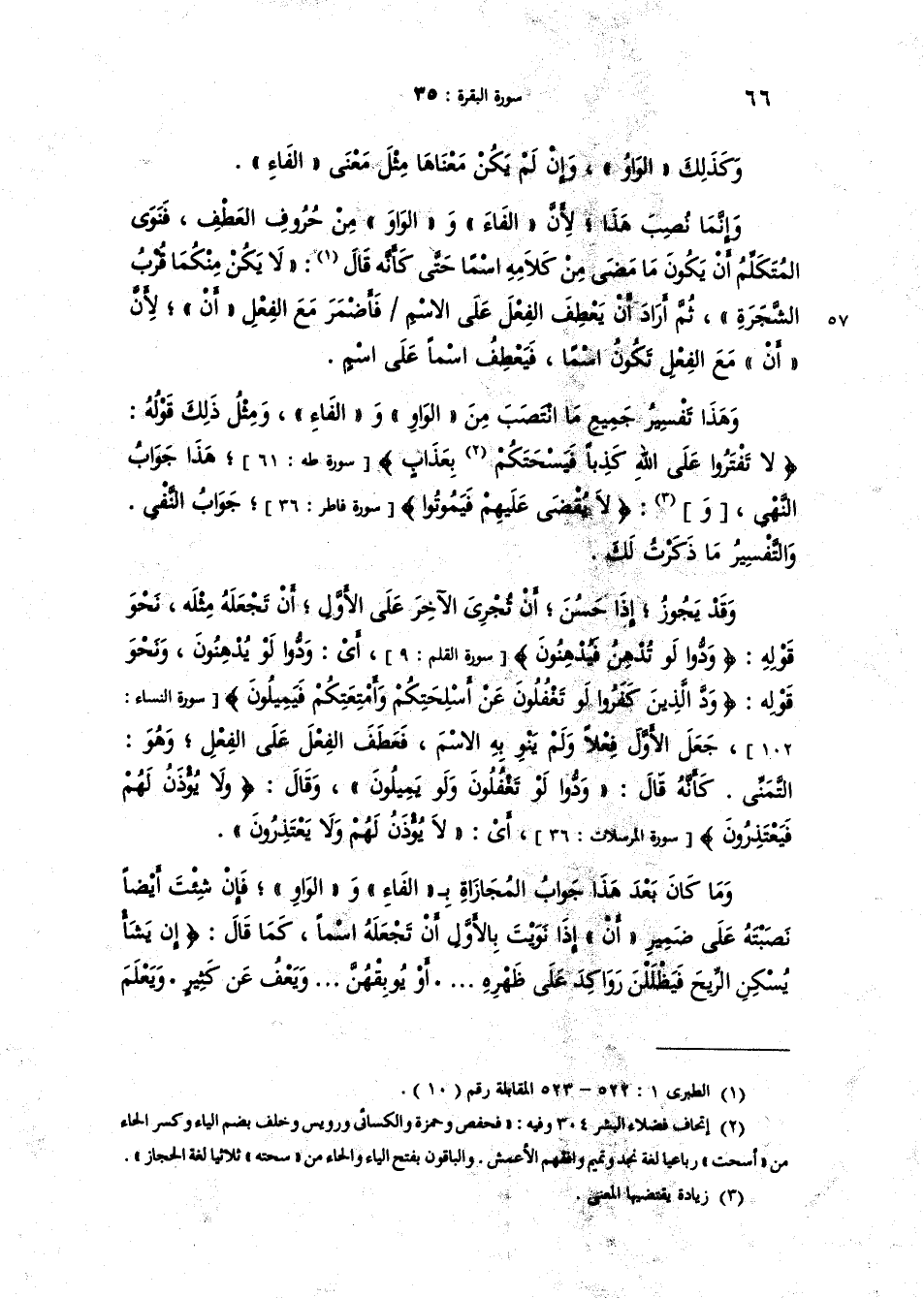 وكذلك الواو. وان لم يكن معناها مثل معنى الفاء. وانما نصب هذا لان الفاء والواو من حروف العطف فنوى المتكلم ان يكون ما مضى من كلامه اسما حتى كأنه قال "لا يكُنْ منكما قربُ الشجرة" ثم أراد أن يعطف الفعل على الاسم [28ب] فأضمر مع الفعل "أَنْ" لأنَّ "أَنْ" مع الفعل تكون اسما فيعطف اسما على اسم. وهذا تفسير جميع ما انتصب من الواو والفاء. ومثل ذلك قوله {لاَ تَفْتَرُواْ عَلَى اللَّهِ كَذِباً فَيُسْحِتَكُم بِعَذَابٍ} هذا جواب النهي و {لاَ يُقْضَى عَلَيْهِمْ فَيَمُوتُواْ} جواب النفي. والتفسير ما ذكرت لك.