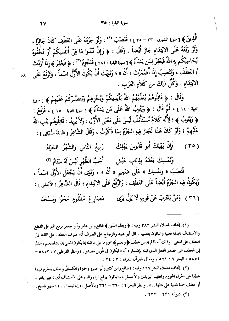 الَّذِينَ} فنصب، ولو جزمه على العطف كان جائزا، ولو رفعه على الابتداء جاز ايضاً. وقال {وَإِن تُبْدُواْ مَا فِي أَنْفُسِكُمْ أَوْ تُخْفُوهُ يُحَاسِبْكُمْ بِهِ اللَّهُ فَيَغْفِرُ لِمَن يَشَآءُ} فتجزم {فَيَغفِر} اذا أردت [29ء] العطف، وتنصب اذا أضمرت "إنْ" ونويت أن يكون الأول اسما، وترفع على الابتداء وكل ذلك من كلام العرب. وقال {قَاتِلُوهُمْ يُعَذِّبْهُمُ اللَّهُ بِأَيْدِيكُمْ وَيُخْزِهِمْ وَيَنْصُرْكُمْ عَلَيْهِمْ} ثم قال {وَيَتُوبُ اللَّهُ عَلَى مَن يَشَآءُ} فرفع {وَيَتُوبُ} لأنَه كلام مستأنف ليس على معنى الأول. ولا يريد "قاتلوهم: "يتبْ الله عليهم" ولو كان هذا لجاز فيه الجزم لما ذكرت. وقال الشاعر [من الوافر وهو الشاهد الخامس والثلاثون] :