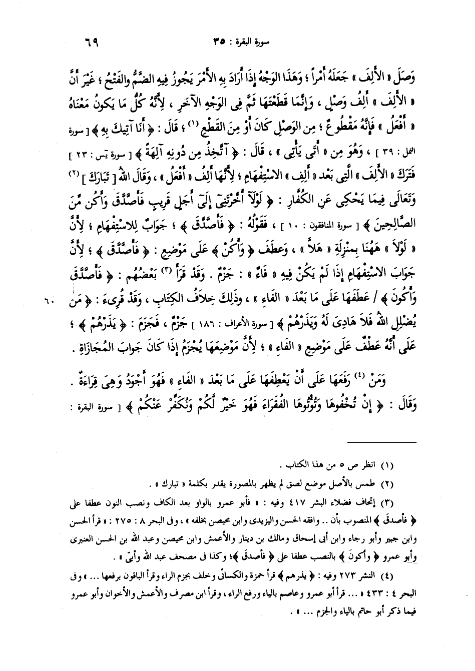 وصل الالفَ جعله أَمْرا. وهذا الوجه اذا أراد به الامر يجوز فيه الضم والفتح. غير ان الالف ألف وصل وانما قطعتها "ثُمَّ" في الوجه الآخر، لانه كل ما يكون معناه "أَفْعَلُ" فانه مقطوع، من الوصل كان أو من القطع. قال {أَنَاْ آتِيكَ بِهِ} وهو من "أتى" "يأتي" وقال {أَتَّخِذُ مِن دُونِهِ آلِهَةً} فترك الالف التي بعد ألف الاستفهام لانها الف "أفعل" وقال الله تبارك* وتعالى فيما يحكى عن الكفار {لَوْلا أَخَّرْتَنِي إِلَى أَجَلٍ قَرِيبٍ فَأَصَّدَّقَ وَأَكُن مِّنَ الصَّالِحِينَ} فقوله {فَأَصَّدَّقَ} جواب للاستفهام، لأنَّ {لَوْلا} ها هنا بمنزلة "هلا" وعطف {وَأَكُن} على موضع {فَأَصَّدَّقَ} لأنَّ جواب الاستفهام اذا لم يكن فيه فاء جزم. وقد قرأ بعضهم {فَأَصَّدَّقَ وَأَكُونَ} [30ء] عطفها على ما بعد الفاء وذلك خلاف الكتاب. وقد قرىء {مَن يُضْلِلِ اللَّهُ فَلاَ هَادِيَ لَهُ وَيَذَرُهُمْ} جزم. فجزم {يَذَرْهُم} على انه عطف على موضع الفاء لان موضعها يجزم اذا كانت جواب المجازاة، ومن رفعها على أَنْ يعطفها على ما بعد الفاء فهو أجود وهي قراءة. وقال {وَإِن تُخْفُوهَا وَتُؤْتُوهَا الْفُقَرَآءَ فَهُوَ خَيْرٌ لَّكُمْ وَيُكَفِّرُ عَنكُم}