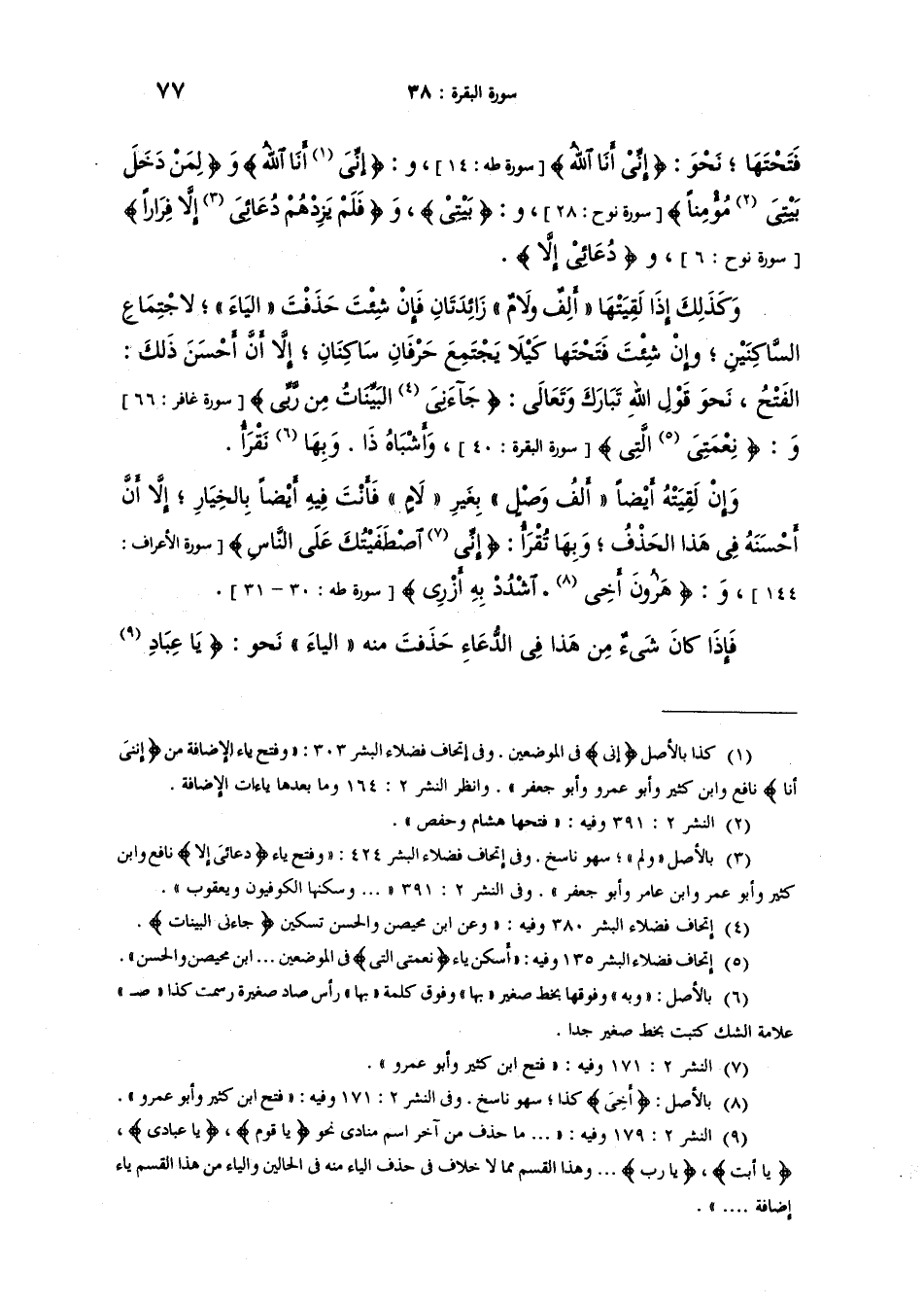 فتحتها نحو {إِنِّيْ أَنَا اللَّهُ} و {إِنِّي أَنَا اللَّهُ} ، و {وَلِمَن دَخَلَ بَيْتِيْ مُؤْمِناً} و {بَيْتِيَ} [و] {فَلَمْ يَزِدْهُمْ دُعَآئِيْ إِلاَّ فِرَاراً} و {دُعَآئِي إِلاَّ} . وكذلك اذا لقيتها الف ولام زائدتان فان شئت حذفت الياء لاجتماع الساكنين وان شئت فتحتها كيلا يجتمع حرفان ساكنان. الا ان احسن ذلك الفتح نحو قول الله تبارك وتعالى {جَآءَنِيَ الْبَيِّنَاتُ مِن رَّبِّي} و {نِعْمَتِيَ الَّتِي} وأشباهِ ذا. وبه نقرأ. وإنْ لقيته ايضاً ألف وصل بغير لام فأنت فيه أيضاً بالخيار إلاّ أَنَ أحسنه في هذا الحذف وبها نقرأ {إِنِّي اصْطَفَيْتُكَ عَلَى النَّاسِ} و {هَارُونَ أَخِي اشْدُدْ بِهِ أَزْرِي} .