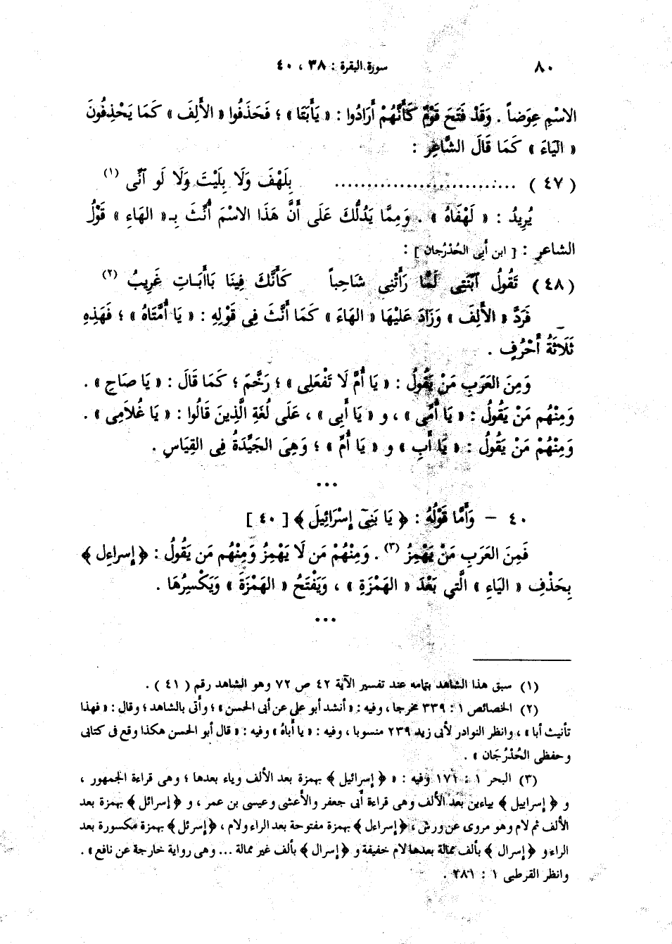 أما قوله {يَابَنِي إِسْرَائِيلَ} فمن العرب من يهمِزُ ومنهم من لا يهمز. ومنه من يقول {إسرَائِل} يحذف الياء التي بعد الهمزة ويفتح الهمزة ويكسرها.