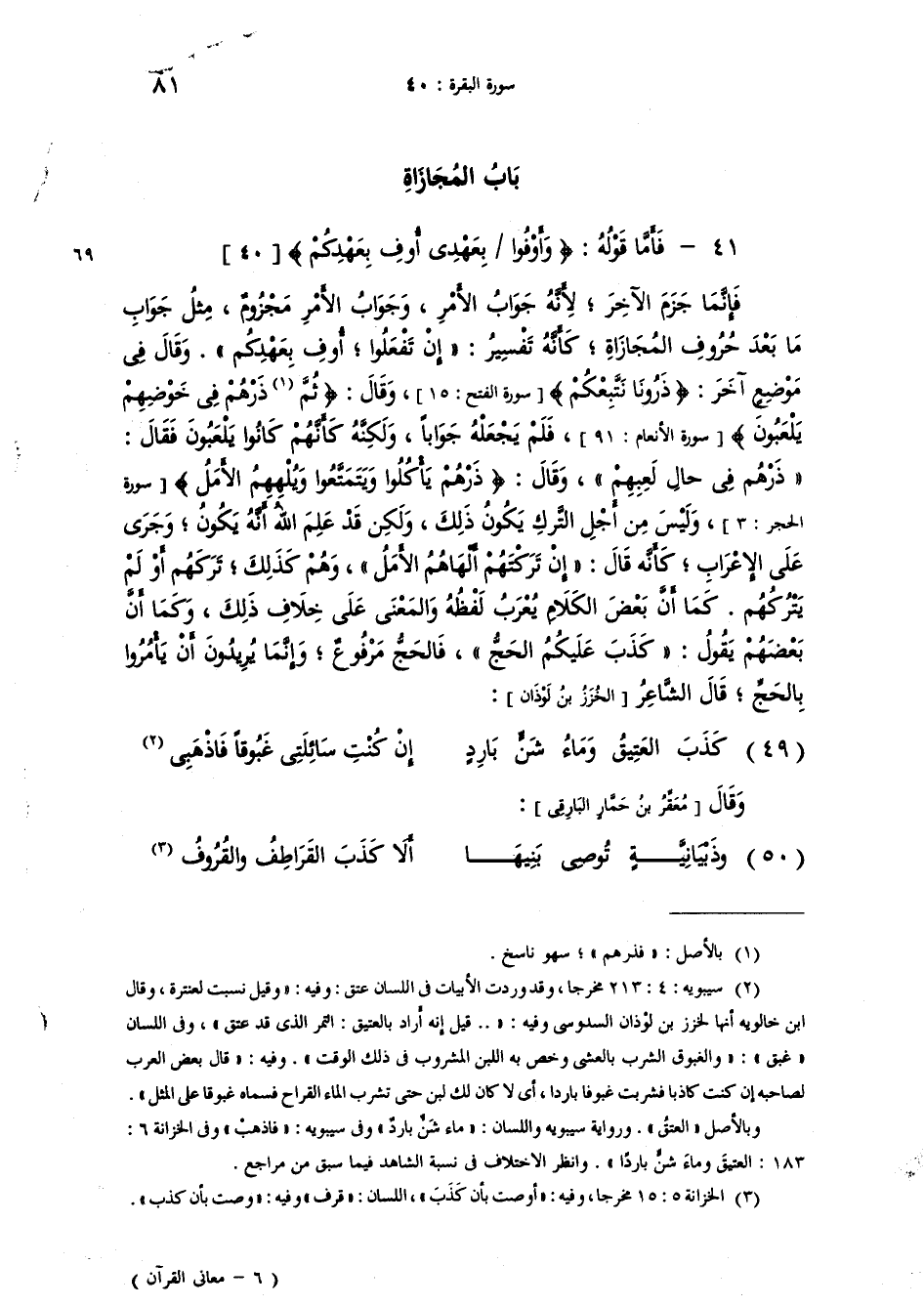فاما قوله {وَأَوْفُواْ [34ب] بِعَهْدِي أُوفِ بِعَهْدِكُمْ} فانما جزم الآخر لانه جواب الامر، وجواب الامر مجزوم مثل جواب ما بعد حروف المجازاة، كأنه تفسير "إنْ تَفْعلوا" أُوفِ بَعَهْدِكُم وقال في موضع آخر {ذَرُونَا نَتَّبِعْكُمْ} وقال {فَذَرْهُمْ فِي خَوْضِهِمْ يَلْعَبُونَ} فلم يجعله جوابا، ولكنه كأنهم كانوا يلعبون فقال "ذَرْهُم في حال لعبهم" وقال {ذَرْهُمْ يَأْكُلُواْ وَيَتَمَتَّعُواْ وَيُلْهِهِمُ الأَمَلُ} وليس من أجل الترك يكون ذلك، ولكن قد علم الله انه يكون وجرى على الاعراب كأنه قال: "إنْ تركتهم أَلْهاهُم الامل" وهم كذلك تركهم او لم يتركهم. كما ان بعض الكلام يعرف لفظه والمعنى على خلاف ذلك , وكما ان بعضهم يقول: "كَذَبَ عليكُمُ الحجّ".