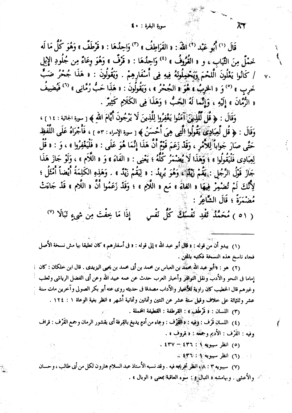 قال ابو عبد الله: "القَراطِفُ"، واحدها "قَرْطَفٌ": وهو كل ما له خَمَلٌ من الثياب. و "القُروفُ"، واحدها "قَرْفٌ": وهو وعاءٌ من جلود الابل [35ء] كانوا يَغَلون اللحم ويحملونه فيه في أسفارهم". ويقولون "هذا جُحرُ ضبٍّ خَرِبٍ" والخرب هو الجُحْرُ. ويقولون، [أحدهم] : "هذا حبُّ رُمّاني". فيضيف الرُمّان اليه وانما له الحبّ وهذا في الكلام كثير.