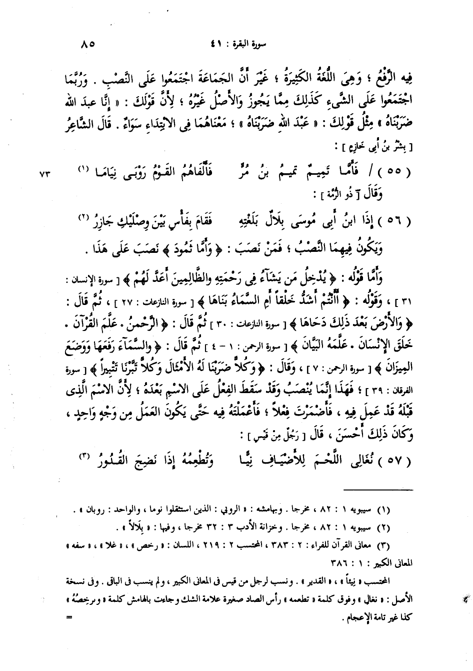 فيه الرفع وهي اللغة الكثيرة غير ان الجماعة اجتمعوا على النصب، وربما اجتمعوا على الشيء كذلك مما يجوز والاصل غيره. لان قولك: "إنّا عَبدُ اللهِ ضَرَبْناهُ". مثل قولك: "عبدُ اللهِ ضَرَبْناهُ" لان معناهما في الابتداء سواء. قال الشاعر [من المتقارب وهو الشاهد الرابع والخمسون] :