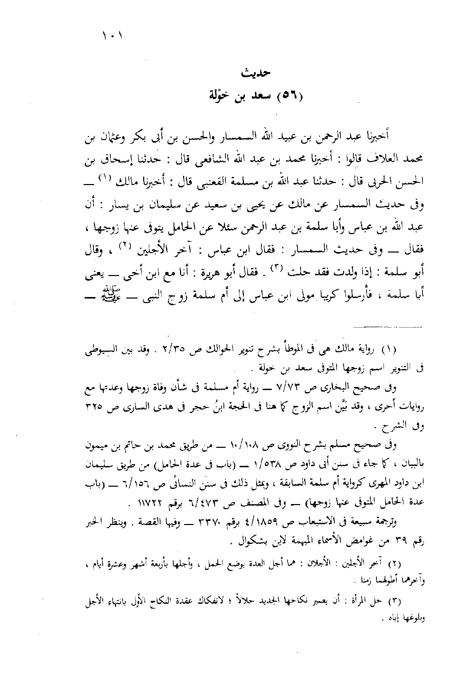 أَخْبَرَنَا عَبْدُ الرَّحْمَنِ بْنُ عُبَيْدِ اللَّهِ السِّمْسَارُ وَالْحَسَنُ بْنُ أَبِي بَكْرٍ وَعُثْمَانُ بْنُ مُحَمَّدٍ الْعَلافُ قَالُوا: أَخْبَرَنَا مُحَمَّدُ بْنُ عَبْدِ اللَّهِ الشَّافِعِيُّ قَالَ: حَدَّثَنَا إِسْحَاقُ بْنُ الْحَسَنِ الْحَرْبِيُّ قَالَ: حَدَّثَنَا عَبْدُ اللَّهِ بْنُ مَسْلَمَةَ الْقَعْنَبِيُّ قَالَ: أَخْبَرَنَا مَالِكٌ - وَفِي حَدِيثِ السِّمْسَارِ عَنْ مَالِكٍ عَنْ يَحْيَى بْنِ سَعِيدٍ عَنْ سُلَيْمَانَ بْنِ يَسَارٍ: أَنَّ عَبْدَ اللَّهِ بْنَ عَبَّاسٍ وَأَبَا سَلَمَةَ بْنَ عَبْدِ الرَّحْمَنِ سُئِلا عَنِ الْحَامِلِ يُتَوَفَّى عَنْهَا زَوْجُهَا، فَقَالَ - وَفِي حَدِيثِ السِّمْسَارِ: فَقَالَ ابْنُ عَبَّاسٍ: آخِرُ الأَجَلَيْنِ، وَقَالَ أَبُو سَلَمَةَ: إِذَا وَلَدَتْ فَقَدْ حَلَّتْ. فَقَالَ أَبُو هُرَيْرَةَ: أَنَا مَعَ ابْنِ أَخِي - يَعْنِي أَبَا سَلَمَةَ، فَأَرْسَلُوا كُرَيْبًا مَوْلَى ابْنِ عَبَّاسٍ إِلَى أُمِّ سَلَمَةَ زَوْجِ النَّبِيِّ - صَلَّى اللَّهُ عَلَيْهِ وَسَلَّم َ -