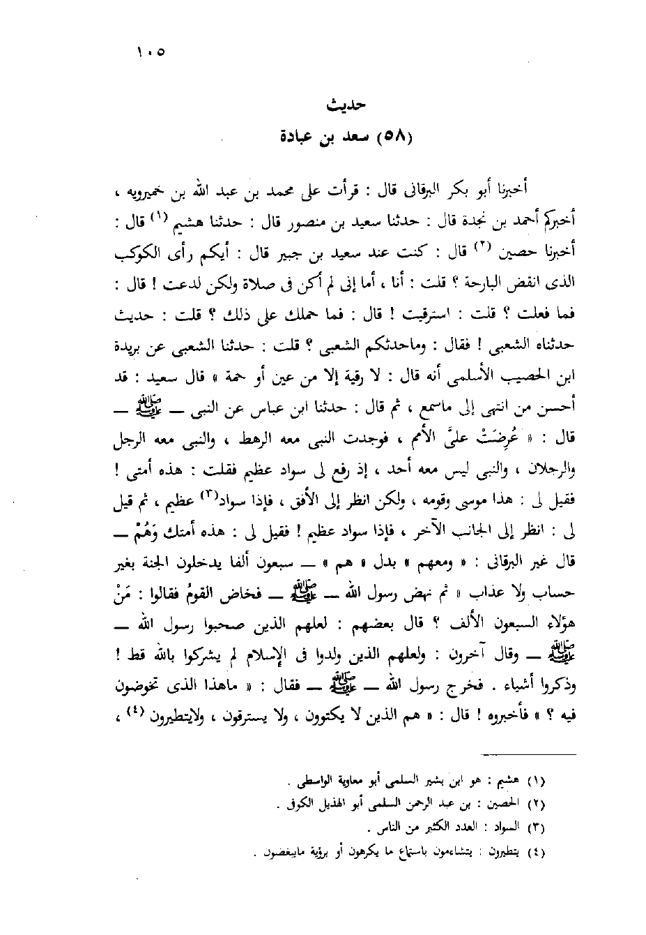 أَخْبَرَنَا أَبُو بَكْرٍ الْبَرْقَانِيُّ قَالَ: قَرَأْتُ عَلَى مُحَمَّدِ بْنِ عَبْدِ اللَّهِ بْنِ خُمَيْرَوَيْهِ، أَخْبَرَكُمْ أَحْمَدُ بْنُ نَجْدَةَ قَالَ: حَدَّثَنَا سَعِيدُ بْنُ مَنْصُورٍ قَالَ: حَدَّثَنَا هُشَيْمٌ قَالَ: أَخْبَرَنَا حُصَيْنٌ قَالَ: كُنْتُ عِنْدَ سَعِيدِ بْنِ جُبَيْرٍ قَالَ: أَيُّكُمْ رَأَى الْكَوْكَبَ الَّذِي انْقَضَّ الْبَارِحَةَ؟ قُلْتُ: أَنَا، أَمَا إِنِّي لَمْ أَكُنْ فِي صَلاةٍ وَلَكِنْ لُدِعْتُ {قَالَ: فَمَا فَعَلْتَ؟ قُلْتُ: اسْتُرْقِيتُ} قَالَ: فَمَا حَمَلَكَ عَلَى ذَلِكَ؟ قُلْتُ: حَدِيثٌ حَدَّثَنَاهُ الشَّعْبِيُّ {فَقَالَ: وَمَا حَدَّثَكُمُ الشَّعْبِيُّ؟ قُلْتُ: حدثنا الشعبي عن بريدة ابن الْحُصَيْبِ الأَسْلَمِيِّ أَنَّهُ قَالَ: لا رُقْيَةَ إِلا مِنْ عَيْنٍ أَوْ حُمَةٍ " قَالَ سَعِيدٌ: قَدْ أَحْسَنَ مَنِ انْتَهَى إِلَى مَا سَمِعَ، ثُمَّ قَالَ: حَدَّثَنَا ابْنُ عَبَّاسٍ عَنِ النَّبِيِّ - صَلَّى اللَّهُ عَلَيْهِ وَسَلَّم َ - قَالَ: " عُرِضَتْ عَلَيَّ الأُمَمُ، فَوَجَدْتُ النَّبِيَّ مَعَهُ الرَّهْطُ، وَالنَّبِيَّ مَعَهُ الرَّجُلُ وَالرَّجُلانِ، وَالنَّبِيَّ لَيْسَ مَعَهُ أَحَدٌ، إِذْ رُفِعَ لِي سَوَادٌ عَظِيمٌ فَقُلْتُ: هَذِهِ أُمَّتِي} فَقِيلَ لِي: هَذَا مُوسَى وَقَوْمُهُ، وَلَكِنِ انْظُرْ إِلَى الأُفُقِ، فَإِذَا سَوَادٌ عَظِيمٌ، ثُمَّ قِيلَ لِي: انْظُرْ إِلَى الْجَانِبِ الآَخَرِ، فَإِذَا سَوَادٌ عَظِيمٌ {فَقِيل لِي: هَذِهِ أُمَّتُكُ وَهُمْ - قَالَ غَيْرُ الْبَرْقَانِيِّ: " وَمَعَهُمْ " بَدَلَ " هُمْ " - سَبْعُونَ أَلْفًا يَدْخُلُونَ الْجَنَّةَ بِغَيْرِ حِسَابٍ وَلا عَذَابٍ " ثُمَّ نَهَضَ رَسُولُ اللَّهِ - صَلَّى اللَّهُ عَلَيْهِ وَسَلَّم َ - فَخَاضَ الْقَوْمُ فَقَالُوا: مَنْ هَؤُلاءِ السَّبْعُونَ الأَلْفُ؟ قَالَ بَعْضُهُمْ: لَعَّلَهُمُ الَّذِينَ صَحِبُوا رَسُولَ اللَّهِ - صَلَّى اللَّهُ عَلَيْهِ وَسَلَّم َ - وَقَالَ آَخَرُونَ: وَلَعَلَّهُمُ الَّذِينَ وُلِدُوا فِي الإِسْلامِ لَمْ يُشْرِكُوا بِاللَّهِ قَطُّ} وَذَكَرُوا أَشْيَاءَ. فَخَرَجَ رَسُولُ اللَّهِ - صَلَّى اللَّهُ عَلَيْهِ وَسَلَّم َ - فَقَالَ: " مَا هَذَا الَّذِي تَخُوضُونَ فِيهِ؟ " فَأَخْبَرُوهُ! قَالَ: " هُمُ الَّذِينَ لا يَكْتَوُونَ، وَلا يَسْتَرْقُونَ، وَلا يتطيرون،