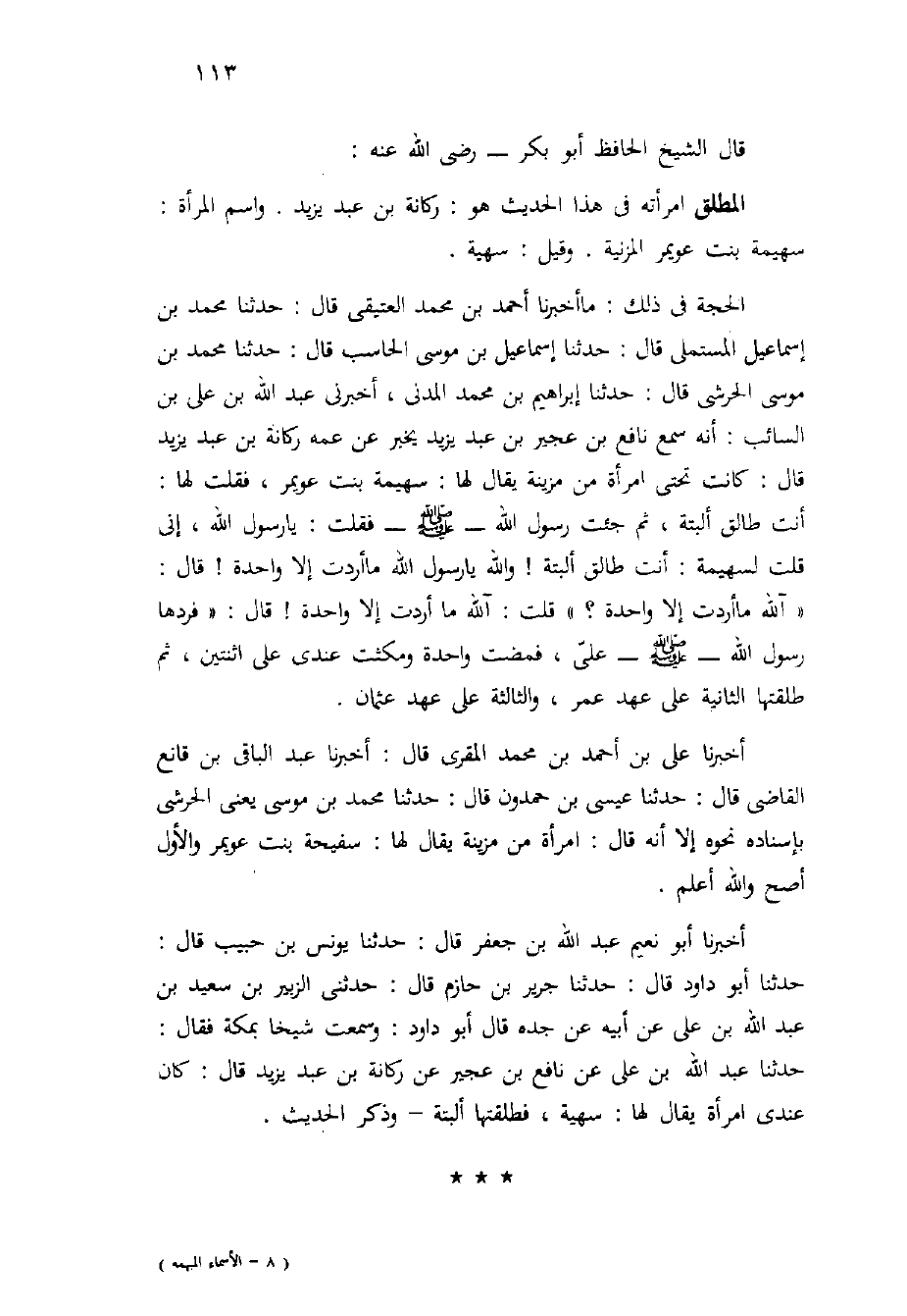 أَخْبَرَنَا عَلِيُّ بْنُ أَحْمَدَ بْنِ مُحَمَّدٍ الْمُقْرِي قَالَ: أَخْبَرَنَا عَبْدُ الْبَاقِي بْنُ قَانِعٍ الْقَاضِي قَالَ: حَدَّثَنَا عِيسَى بْنُ حَمْدُونٍ قَالَ: حَدَّثَنَا مُحَمَّدُ بْنُ مُوسَى يَعْنِي الْحَرَشِيَّ بِإِسْنَادِهِ نَحْوَهُ إِلا أَنَّهُ قَالَ: امْرَأَةٌ مِنْ مُزَيْنَةَ يُقَالُ لَهَا: سُفَيْحَةُ بِنْتُ عُوَيْمِرَ وَالأَوَّلُ أَصَحُّ وَاللَّهُ أَعْلَمُ.