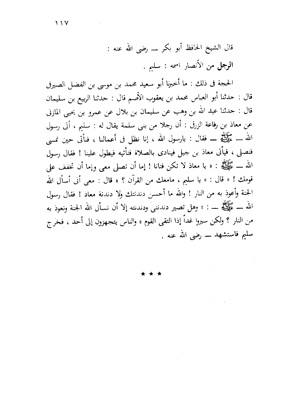 الحجة فِي ذلك: مَا أَخْبَرَنَا أَبُو سَعِيدٍ مُحَمَّدُ بْنُ مُوسَى بْنِ الْفَضْلِ الصَّيْرَفِيُّ قَالَ: حَدَّثَنَا أَبُو الْعَبَّاسِ مُحَمَّدُ بْنُ يَعْقُوبَ الأَصَمُّ قَالَ: حَدَّثَنَا الرَّبِيعُ بْنُ سُلَيْمَانَ قَالَ: حَدَّثَنَا عَبْدُ اللَّهِ بْنُ وَهْبٍ عَنْ سُلَيْمَانَ بْنِ بِلالٍ عَنْ عَمْرِو بْنِ يَحْيَى الْمَازِنِيِّ عَنْ مُعَاذِ بْنِ رِفَاعَةَ الزُّرَقِيِّ: أَنَّ رَجُلا مِنْ بَنِي سَلَمَةَ يُقَالُ لَهُ: سُلَيْمٌ، أَتَى رَسُولَ اللَّهِ - صَلَّى اللَّهُ عَلَيْهِ وَسَلَّم َ - فَقَالَ: يَا رَسُولَ اللَّهِ، إِنَّا نَظَلُّ فِي أَعْمَالِنَا، فَنَأْتِي حِينَ نُمْسِي فَنُصَلِّي، فَيَأْتِي مُعَاذُ بْنُ جَبَلٍ فَيُنَادِي بِالصَّلاةِ فَنَأْتِيهِ فَيُطَوِّلُ عَلَيْنَا {فَقَالَ رَسُولُ اللَّهِ - صَلَّى اللَّهُ عَلَيْهِ وَسَلَّم َ -: " يَا مُعَاذُ لا تَكُنْ فَتَّانًا} إِمَّا أَنْ تُصَلِّيَ مَعِي وَإِمَّا أَنْ تُخَفِّفَ عَلَى قَوْمِكَ {" قَالَ: " يَا سُلَيْمُ، مَا مَعَكَ مِنَ الْقُرْآَنِ؟ " قَالَ: مَعِي أَنِّي أَسْأَلُ اللَّهَ الْجَنَّةَ وَأَعُوذُ بِهِ مِنَ النَّارِ} وَاللَّهِ مَا أُحْسِنُ دَنْدَنَتَكَ وَلا دَنْدَنَةَ مُعَاذٍ! فَقَالَ رَسُولُ اللَّهِ - صَلَّى اللَّهُ عَلَيْهِ وَسَلَّم َ -: " وَهَلْ تَصِيرُ دَنْدَنَتِي وَدَنْدَنَتُهُ إِلا أَنْ نَسْأَلَ اللَّهَ الْجَنَّةَ وَنَعُوذَ بِهِ مِنَ النَّارِ؟ وَلَكِنْ سِيرُوا غَدًا إِذَا الْتَقَى الْقَوْمُ " وَالنَّاسُ يَتَجَهَّزُونَ إِلَى أُحُدٍ، فَخَرَجَ سُلَيْمٌ فاستشهد - رضي الله عنه.