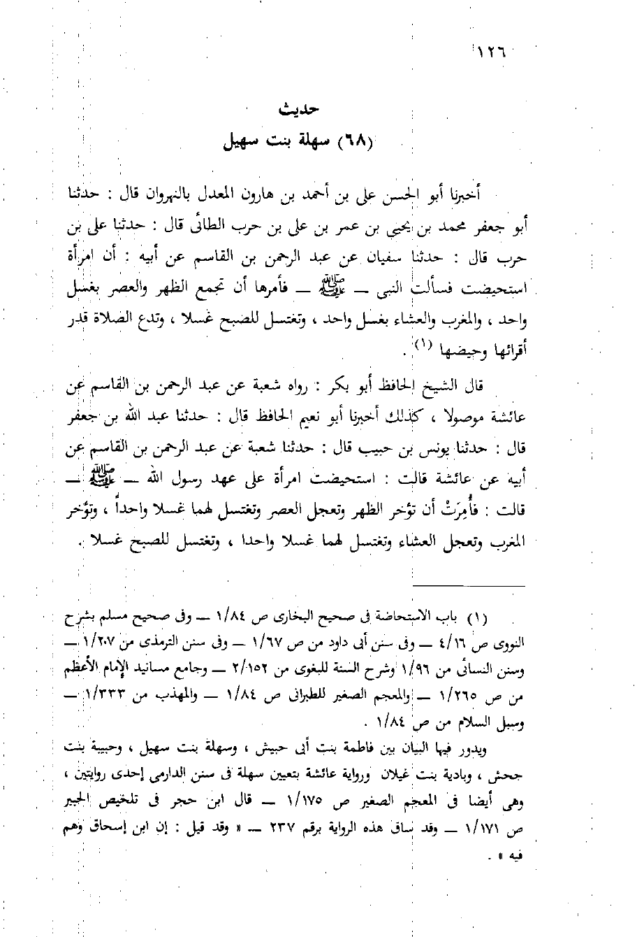 أَخْبَرَنَا أَبُو الْحَسَنِ عَلِيُّ بْنُ أَحْمَدَ بْنِ هَارُونَ الْمُعَدَّلُ بِالنَّهْرَوَانِ قَالَ: حَدَّثَنَا أَبُو جَعْفَرٍ مُحَمَّدُ بْنُ يَحْيَى بْنِ عُمَرَ بْنِ عَلِيِّ بْنِ حَرْبٍ الطَّائِيُّ قَالَ: حَدَّثَنَا عَلِيُّ بْنُ حَرْبٍ قَالَ: حَدَّثَنَا سُفْيَانُ عَنْ عَبْدِ الرَّحْمَنِ بْنِ الْقَاسِمِ عَنْ أَبِيهِ: أَنَّ امْرَأَةً اسْتُحِيضَتْ فَسَأَلَتِ النَّبِيِّ - صَلَّى اللَّهُ عَلَيْهِ وَسَلَّم َ - فَأَمَرَهَا أَنْ تَجْمَعَ الظُّهْرَ وَالْعَصْرَ بِغُسْلٍ وَاحِدٍ، وَالْمَغْرِبَ وَالْعِشَاءَ بِغُسْلٍ وَاحِدٍ، وَتَغْتَسِلَ لِلصُّبْحِ غُسْلا، وَتَدَعَ الصَّلاةَ قَدْرَ أَقْرَائِهَا وَحَيْضِهَا.