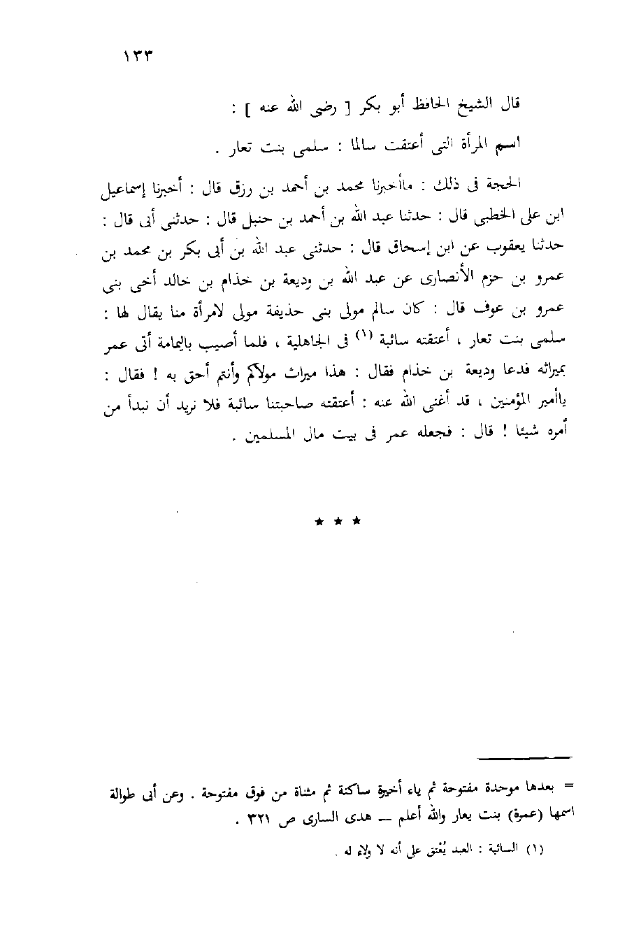 الحجة فِي ذلك: مَا أَخْبَرَنَا مُحَمَّدُ بْنُ أَحْمَدَ بْنِ رزق قال: أخبرنا إسماعيل ابن عَلِيٍّ الْخُطَبِيُّ قَالَ: حَدَّثَنَا عَبْدُ اللَّهِ بْنُ أَحْمَدَ بْنِ حَنْبَلٍ قَالَ: حَدَّثَنِي أَبِي قَالَ: حَدَّثَنَا يَعْقُوبُ عَنِ ابْنِ إِسْحَاقَ قَالَ: حَدَّثَنِي عَبْدُ اللَّهِ بْنُ أَبِي بَكْرِ بْنِ مُحَمَّدِ بْنِ عَمْرِو بْنِ حَزْمٍ الْأَنْصَارِيُّ عَنْ عَبْدِ اللَّهِ بْنِ وَدِيعَةَ بْنِ خُذَامِ بْنِ خَالِدٍ أَخِي بَنِي عَمْرِو بْنِ عَوْفٍ قَالَ: كَانَ سَالِمٌ مَوْلَى بَنِي حُذَيْفَةَ مَوْلًى لامْرَأَةٍ مِنَّا يُقَالُ لَهَا: سَلْمَى بِنْتُ تِعَارٍ، أَعْتَقَتْهُ سَائِبَةً فِي الْجَاهِلِيَّةِ، فَلَمَّا أُصِيبَ بِالْيَمَامَةِ أَتَى عُمَرَ بِمِيرَاثِهِ فَدَعَا وَدِيعَةَ بْنَ خُذَامٍ فَقَالَ: هَذَا مِيرَاثُ مَوْلاكُمْ وَأَنْتُمْ أَحَقُّ بِهِ {فَقَالَ: يَا أَمِيرَ الْمُؤْمِنِينَ، قَدْ أَغْنَى اللَّهُ عَنْهُ: أَعْتَقَتْهُ صَاحِبَتُنَا سَائِبَةً فَلا نُرِيدُ أَنْ نَبْدَأَ مِنْ أَمْرِهِ شَيْئًا} قَالَ: فَجَعَلَهُ عُمَرُ فِي بَيْتِ مال المسلمين.