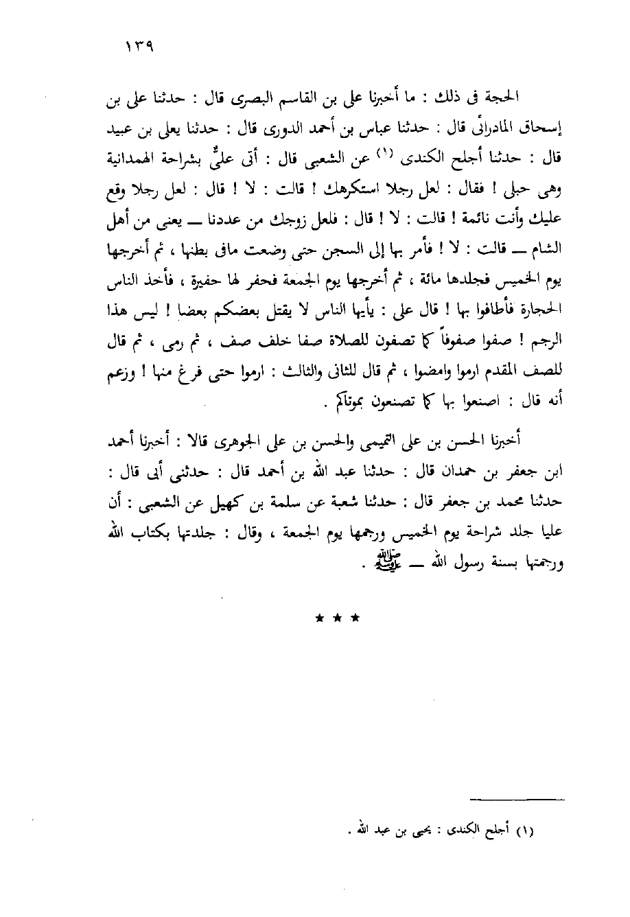 أَخْبَرَنَا الْحَسَنُ بْنُ عَلِيٍّ التَّمِيمِيُّ وَالْحَسَنُ بْنُ عَلِيٍّ الْجَوْهَرِيُّ قَالا: أخبرنا أحمد ابن جَعْفَرِ بْنِ حَمْدَانَ قَالَ: حَدَّثَنَا عَبْدُ اللَّهِ بْنُ أَحْمَدَ قَالَ: حَدَّثَنِي أَبِي قَالَ: حَدَّثَنَا مُحَمَّدُ بْنُ جَعْفَرٍ قَالَ: حَدَّثَنَا شُعْبَةُ عَنْ سَلَمَةَ بْنِ كُهَيْلٍ عَنِ الشَّعْبِيِّ: أَنَّ عَلِيًّا جَلَدَ شراحَةَ يَوْمَ الْخَمِيسِ وَرَجَمَهَا يَوْمَ الْجُمُعَةِ، وَقَالَ: جَلَدْتُهَا بِكِتَابِ اللَّهِ وَرَجَمْتُهَا بِسُنَّةِ رَسُولِ اللَّهِ - صَلَّى اللَّهُ عَلَيْهِ وَسَلَّم َ -.