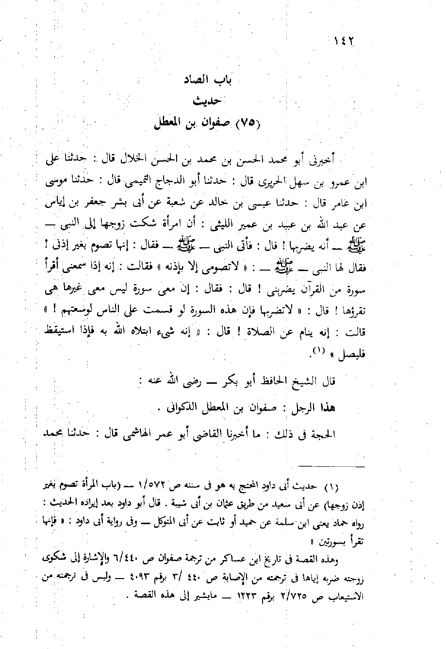أَخْبَرَنِي أَبُو مُحَمَّدٍ الْحَسَنُ بْنُ مُحَمَّدِ بْنِ الْحَسَنِ الخلال قال: حدثنا علي ابن عَمْرِو بْنِ سَهْلٍ الْحَرِيرِيُّ قَالَ: حَدَّثَنَا أَبُو الدَّجَّاجِ التَّمِيمِيُّ قَالَ: حدثنا موسى ابن عَامِرٍ قَالَ: حَدَّثَنَا عِيسَى بْنُ خَالِدٍ عَنْ شُعْبَةَ عَنْ أَبِي بِشْرٍ جَعْفَرِ بْنِ إِيَاسَ عَنْ عَبْدِ اللَّهِ بْنِ عُبَيْدِ بْنِ عُمَيْرٍ اللَّيْثِيِّ: أَنَّ امْرَأَةً شَكَتْ زَوْجَهَا إِلَى النَّبِيِّ - صَلَّى اللَّهُ عَلَيْهِ وَسَلَّم َ - أَنَّهُ يَضْرِبُهَا {قَالَ: فَأَتَى النَّبِيَّ - صَلَّى اللَّهُ عَلَيْهِ وَسَلَّم َ - فَقَالَ: إِنَّهَا تَصُومُ بِغَيْرِ إِذْنِي} فَقَالَ لَهَا النَّبِيُّ - صَلَّى اللَّهُ عَلَيْهِ وَسَلَّم َ -: " لا تَصُومِي إِلا بِإِذْنِهِ " فَقَالَتْ: إِنَّهُ إِذَا سَمِعَنِي أَقْرَأُ سُورَةً مِنَ الْقُرْآنِ يَضْرِبُنِي {قَالَ: فَقَالَ: إِنَّ مَعِي سُورَةً لَيْسَ مَعِي غَيْرُهَا هِيَ تَقْرَؤُهَا} قَالَ: " لا تَضْرِبْهَا فَإِنَّ هَذِهِ السُّورَةَ لَوْ قُسِّمَتْ عَلَى النَّاسِ لَوَسِعَتْهُمْ {" قَالَتْ: إِنَّهُ يَنَامُ عَنِ الصَّلاةِ} قَالَ: " إِنَّهُ شَيْءٌ ابْتَلاهُ اللَّهُ بِهِ فَإِذَا اسْتَيْقَظَ فَلْيُصَلِّ ".