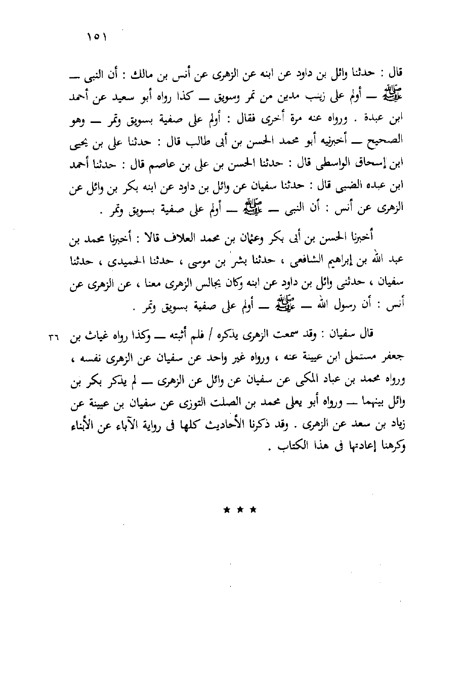 قَالَ: حَدَّثَنَا وَائِلُ بْنُ دَاوُدَ عَنِ ابْنِهِ عَنِ الزُّهْرِيِّ عَنْ أَنَسِ بْنِ مَالِكٍ: أَنَّ النَّبِيَّ - صَلَّى اللَّهُ عَلَيْهِ وَسَلَّم َ - أَوْلَمَ عَلَى زَيْنَبَ مَدْيَنَ مِنْ تمر وسويق - كذا رواه أبو سعيد عن أحمد ابن عَبْدَةَ. وَرَواهُ عَنْهُ مَرَّةً أُخْرَى فَقَالَ: أَوْلَمَ عَلَى صَفِيَّةَ بِسُوَيْقٍ وَتَمْرٍ - وَهُوَ الصَّحِيحُ - أَخْبَرَنِيهِ أَبُو مُحَمَّدٍ الْحَسَنُ بْنُ أَبِي طَالِب قَالَ: حَدَّثَنَا عَلِيُّ بْنُ يَحْيَى ابن إِسْحَاقَ الْوَاسِطِيُّ قَالَ: حَدَّثَنَا الْحَسَنُ بْنُ عَلِيِّ بْنِ عَاصِمٍ قَالَ: حدثنا أحمد ابن عَبْدَةَ الضَّبِّيُّ قَالَ: حَدَّثَنَا سُفْيَانُ عَنْ وَائِلِ بْنِ دَاوُدَ عَنِ ابْنِهِ بَكْرِ بْنِ وَائِلٍ عَنِ الزُّهْرِيِّ عَنْ أَنَسٍ: أَنَّ النَّبِيَّ - صَلَّى اللَّهُ عَلَيْهِ وَسَلَّم َ - أَوْلَمَ عَلَى صَفِيَّةَ بِسُوَيْقٍ وَتَمْرٍ.