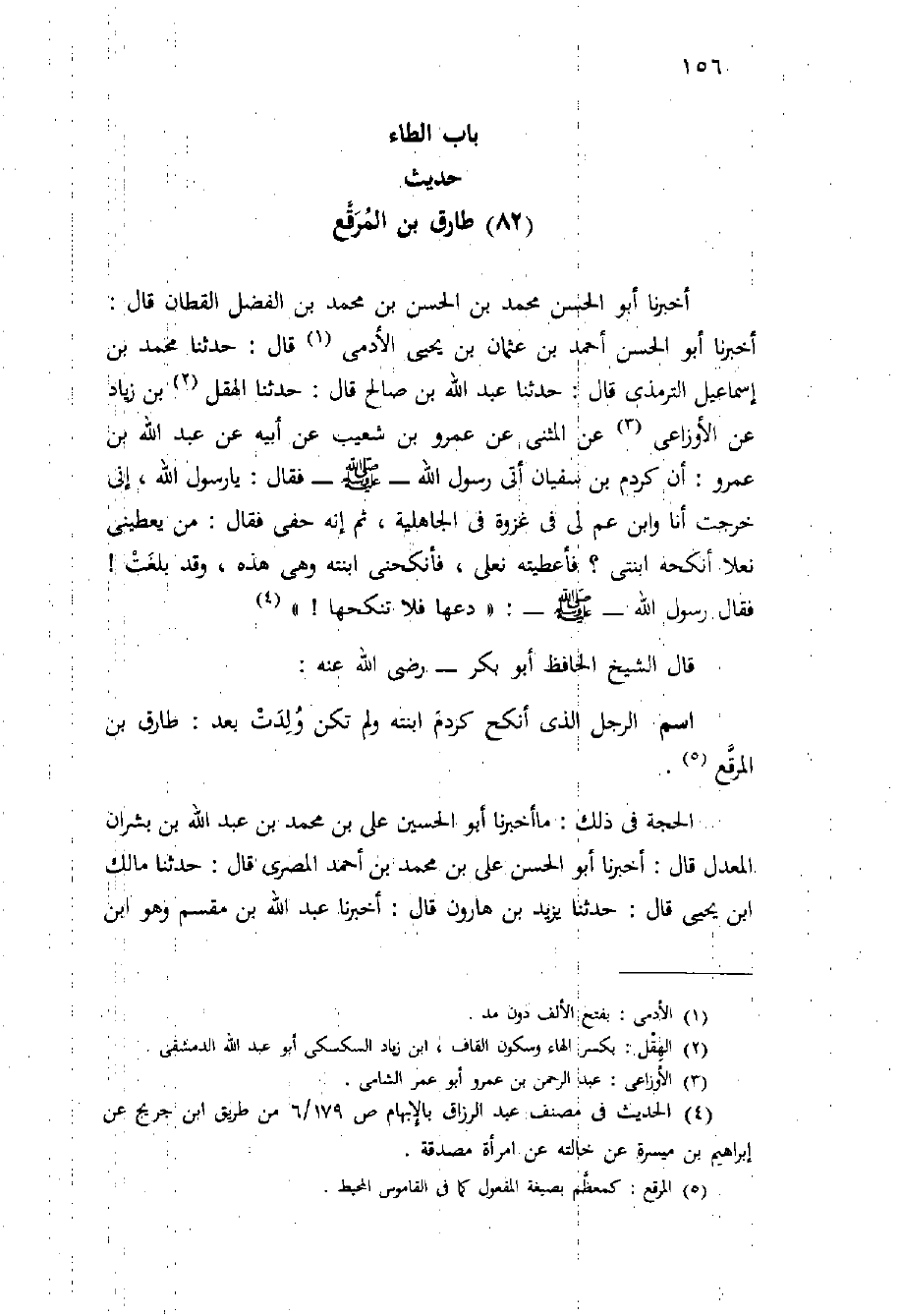 أَخْبَرَنَا أَبُو الْحَسَنِ مُحَمَّدُ بْنُ الْحَسَنِ بْن مُحَمَّدِ بْنِ الْفَضْلِ الْقَطَّانُ قَالَ: أَخْبَرَنَا أَبُو الْحَسَنِ أَحْمَدُ بْنُ عُثْمَانَ بْنِ يَحْيَى الأَدَمِيُّ قَالَ: حَدَّثَنَا مُحَمَّدُ بْنُ إِسْمَاعِيلَ التِّرْمِذِيُّ قَالَ: حَدَّثَنَا عَبْدُ اللَّهِ بْنُ صَالِحٍ قَالَ: حَدَّثَنَا الْهِقْلُ بْنُ زِيَادٍ عَنِ الأَوْزَاعِيِّ عَنِ الْمُثَنَّى عَنْ عَمْرِو بْنِ شُعَيْبٍ عَنْ أَبِيهِ عَنْ عَبْدِ اللَّهِ بْنِ عَمْرٍو: أَنْ كَرْدَمِ بْنَ سُفْيَانَ أَتَى رَسُولُ اللَّهِ - صَلَّى اللَّهُ عَلَيْهِ وَسَلَّم َ - فَقَالَ: يَا رَسُولَ اللَّهِ، إِنِّي خَرَجْتُ أَنَا وَابْنُ عَمٍّ لِي فِي غَزْوَةٍ فِي الْجَاهِلِيَّةِ، ثُمَّ إِنَّهُ حَفِيَ فَقَالَ: مَنْ يُعْطِينِي نَعْلا أُنْكِحْهُ ابْنَتِي؟ فَأَعْطَيْتُهُ نَعْلِي، فَأَنْكَحَنِي ابْنَتَهُ وَهِيَ هَذِهِ، وَقَدْ بَلَغَتْ {فَقَالَ رَسُولُ اللَّهِ - صَلَّى اللَّهُ عَلَيْهِ وَسَلَّم َ -: " دَعْهَا فَلا تَنْكِحْهَا} ".