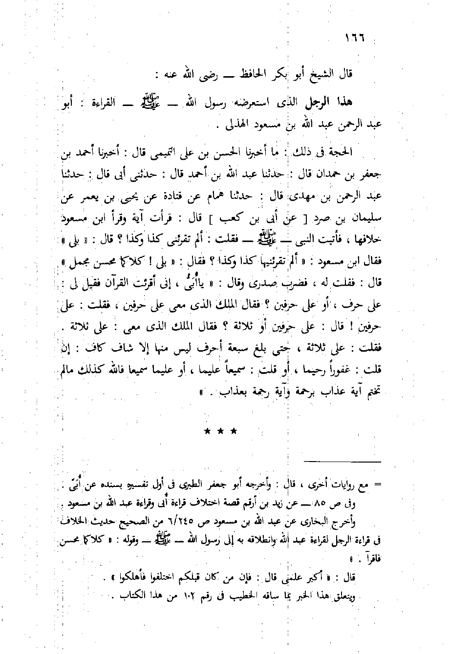 الحجة في ذلك: مَا أَخْبَرَنَا الْحَسَنُ بْنُ عَلِيٍّ التَّمِيمِيُّ قَالَ: أَخْبَرَنَا أَحْمَدُ بْنُ جَعْفَرِ بْنِ حَمْدَانَ قَالَ: حَدَّثَنَا عَبْدُ اللَّهِ بْنُ أَحْمَدَ قَالَ: حَدَّثَنِي أَبِي قَالَ: حَدَّثَنَا عَبْدُ الرَّحْمَنِ بْنُ مَهْدِيٍّ قَالَ: حَدَّثَنَا هَمَّامٌ عَنْ قَتَادَةَ عَنْ يَحْيَى بْنِ يَعْمُرَ عَنْ سُلَيْمَانَ بْنِ صَرْدٍ [عَنْ أُبَيِّ بْنِ كَعْبٍ] قَالَ: قَرَأْتُ آيَةً وَقَرَأَ ابْنُ مَسْعُودٍ خِلافَهَا، فَأَتَيْتُ النَّبِيِّ - صَلَّى اللَّهُ عَلَيْهِ وَسَلَّم َ - فَقُلْتُ: أَلَمْ تُقْرِئْنِي كَذَا وَكَذَا؟ قَالَ: " بَلَى " فَقَالَ ابْنُ مَسْعُودٍ: " أَلَمْ تُقْرِئْنِيهَا كَذَا وَكَذَا؟ فَقَالَ: " بَلَى {كِلاكُمَا مُحْسِنٌ مُجْمِلٌ " قَالَ: فَقُلْتُ لَهُ، فَضَرَبَ صَدْرِي وَقَالَ: " يَا أُبَيُّ، إِنِّي أُقْرِئْتُ الْقُرْآنَ فَقِيلَ لِي: عَلَى حَرْفٍ، أَوْ عَلَى حَرْفَيْنِ؟ فَقَالَ الْمَلَكُ الَّذِي مَعِي عَلَى حَرْفَيْنِ، فَقُلْتُ: عَلَى حَرْفَيْنِ} قَالَ: عَلَى حَرْفَيْنِ أَوْ ثَلاثَةٍ؟ فَقَالَ الْمَلَكُ الَّذِي مَعِي: عَلَى ثَلاثَةٍ. فَقُلْتُ: عَلَى ثَلاثَةٍ، حَتَّى بَلَغَ سَبْعَةَ أَحْرُفٍ لَيْسَ مِنْهَا إِلا شَافٍ كَافٍ: إِنْ قُلْتَ: غَفُورًا رَحِيمًا، أَوْ قُلْتَ: سَمِيعًا عَلِيمًا، أَوْ عَلِيمًا سَمِيعًا فَاللَّهُ كَذَلِكَ مَا لَمْ تَخْتِمْ آيَةَ عَذَابٍ بِرَحْمَةٍ وَآيَةَ رَحْمَةٍ بعذاب. . ".