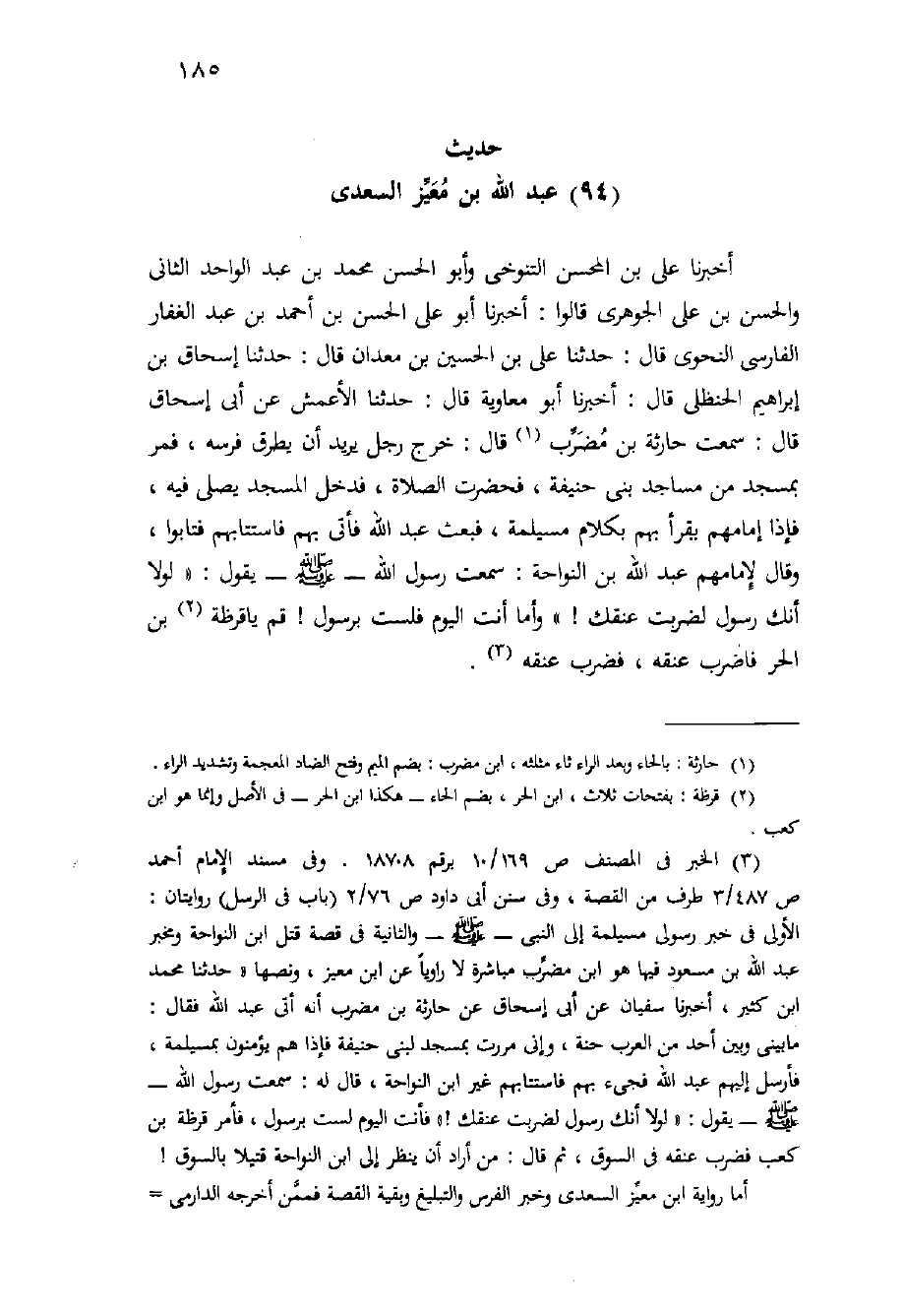 أَخْبَرَنَا عَلِيُّ بْنُ الْمُحْسِنِ التَّنُوخِيُّ وَأَبُو الْحَسَنِ مُحَمَّدُ بْنُ عَبْدِ الْوَاحِدِ الثَّانِي وَالْحَسَنُ بْنُ عَلِيٍّ الْجَوْهَرِيُّ قَالُوا: أَخْبَرَنَا أَبُو عَلِيٍّ الْحَسَنُ بْنُ أَحْمَدَ بْنِ عَبْدِ الْغَفَّارِ الْفَارِسِيُّ النَّحْوِيُّ قَالَ: حَدَّثَنَا عَلِيُّ بْنُ الْحُسَيْنِ بْنِ مِعْدَانَ قَالَ: حَدَّثَنَا إِسْحَاقُ بْنُ إِبْرَاهِيمَ الْحَنْظَلِيُّ قَالَ: أَخْبَرَنَا أَبُو مُعَاوِيَةَ قَالَ: حَدَّثَنَا الْأَعْمَشُ عَنْ أَبِي إِسْحَاقَ قَالَ: سَمِعْتُ حَارِثَةَ بْنَ مُضَرِّبٍ قَالَ: خَرَجَ رَجُلٌ يُرِيدُ أَنْ يَطْرُقَ فَرَسَهُ، فَمَرَّ بِمَسْجِدٍ مِنْ مَسَاجِدِ بَنِي حَنِيفَةَ، فَحَضَرَتِ الصَّلاةُ، فَدَخَلَ الْمَسْجِدَ يُصَلِّي فِيهِ، فَإِذَا إِمَامُهُمْ يَقْرَأُ بِهِمْ بِكَلامِ مُسَيْلِمَةَ، فَبَعَثَ عَبْدَ اللَّهِ فَأَتَى بِهِمْ فَاسْتَتَابَهُمْ فَتَابُوا، وَقَالَ لإِمَامِهِمْ عَبْدِ اللَّهِ بْنِ النَّوَّاحَةِ: سَمِعْتُ رَسُولُ اللَّهِ - صَلَّى اللَّهُ عَلَيْهِ وَسَلَّم َ - يَقُولُ: " لَوْلا أَنَّكَ رَسُولٌ لَضَرَبْتُ عُنُقَكَ {" وَأَمَّا أَنْتَ الْيَوْمَ فَلَسْتَ بِرَسُولٍ} قُمْ يَا قَرَظَةُ بْنَ الْحُرِّ فَاضْرِبْ عُنُقَهُ، فَضَرَبَ عُنُقَهُ.
