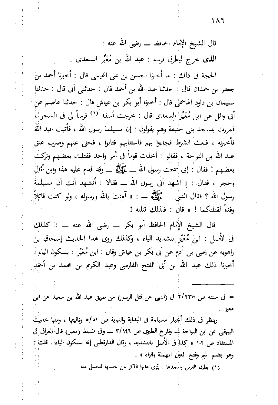 الحجة فِي ذلك: مَا أَخْبَرَنَا الْحَسَنُ بْنُ عَلِيٍّ التَّمِيمِيُّ قَالَ: أَخْبَرَنَا أَحْمَدُ بْنُ جَعْفَرِ بْنِ حَمْدَانَ قَالَ: حَدَّثَنَا عَبْدُ اللَّهِ بْنُ أَحْمَدَ قَالَ: حَدَّثَنِي أَبِي قَالَ: حَدَّثَنَا سُلَيْمَانُ بْنُ دَاوُدَ الْهَاشِمِيُّ قَالَ: أَخْبَرَنَا أَبُو بَكْرِ بْنُ عَيَّاشٍ قَالَ: حَدَّثَنَا عَاصِمٌ عَنْ أَبِي وَائِلٍ عَنِ ابْنِ مُعَيزٍ السَّعْدِيِّ قَالَ: خَرَجْتُ أَسْفِدُ فَرَسًا لِي فِي السَّحَرِ، فمررت بمسجد بني حنيفة وهو يَقُولُونَ: إِنَّ مُسَيْلِمَةَ رَسُولُ اللَّهِ، فَأَتَيْتُ عَبْدَ اللَّهِ فَأَخْبَرْتُهُ، فَبَعَثَ الشُّرْطَ فَجَاءُوا بِهِمْ فَاسْتَتَابَهُمْ فَتَابُوا، فَخَلَّى عَنْهُمْ وَضَرَبَ عُنُقَ عَبْدِ اللَّهِ بْنِ النَّوَّاحَةِ، فَقَالُوا: أَخَذْتَ قَوْمًا فِي أَمْرٍ وَاحِدٍ فَقَتَلْتَ بَعْضَهُمْ وَتَرَكْتَ بَعْضَهُمْ {فَقَالَ: إِنِّي سَمِعْتُ رَسُولَ اللَّهِ - صَلَّى اللَّهُ عَلَيْهِ وَسَلَّم َ - وَقَدْ قَدِمَ عَلَيْهِ هَذَا وَابْنُ أَثَالٍ وَحَجُرٌ، فَقَالَ: " اشْهَدْ أَنِّي رَسُولُ اللَّهِ - فَقَالا: أَتَشْهَدُ أَنْتَ أَنَّ مُسَيْلِمَةَ رَسُولُ اللَّهِ؟ فَقَالَ النَّبِيِّ - صَلَّى اللَّهُ عَلَيْهِ وَسَلَّم َ -: " آمَنْتُ بِاللَّهِ وَرَسُولِهِ، وَلَوْ كُنْتُ قَاتِلًا وَفْدًا لَقَتَلْتُكُمَا} " قَالَ: فَلِذَلِكَ قَتَلْتُهُ!